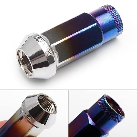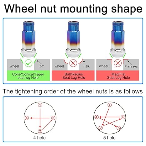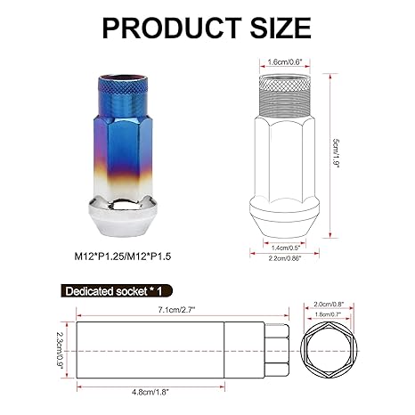 Q845.00 20 tuercas de acero forjado en frío azul quemado de 0.472 in* 1.5 tuercas de rueda extendidas. Las tuercas de rueda de una sola pieza están hechas de acero forjado en frío de alta calidad, y la superficie está cromada. Los excelentes materiales y la tecnología aportan un producto resistente al calor, duradero, anticorrosión, a prueba de óxido y de alta resistencia. Especificaciones: rosca M12x1.5; tuercas estilo abultamiento de extremo abierto; asiento cónico de 60 grados; hexagonal de 0.67 pulgadas; 1.9 pulgadas/1.969 in de largo; titanio o color azul quemado. El paquete incluye: 1 herramienta de zócalo y 20 tuercas. Se adapta perfectamente a la mayoría de los automóviles. Tuercas M12 x 1.5 compatibles con Buck Cadillac Chevy Chrysler Dodge Ford GMC Honda Hyundai Infiniti Jeep Kia Lexus Lincoln Mazda Benz Mini Nissan Porsche Ram Subaru Tesla, Toyota, VW Volvo, etc. Tuercas M12 x 1.25 compatibles con Nissan, Subaru, Suzuki, etc. Nota: Confirme que la forma de la ubicación de instalación coincide antes de comprar. Se recomienda utilizar una llave manual para evitar apretar demasiado. Ofrecemos 12 meses de garantía y servicio al cliente de por vida. Enviamos a toda la republica pago contra entrega. Aceptamos tarjeta de crédito y debito.