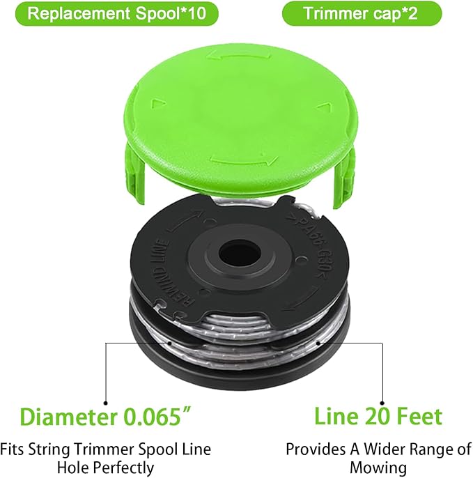 El paquete incluye: 10 carretes de repuesto para recortadora; 2 fundas de repuesto. Operación simple e instalación conveniente.