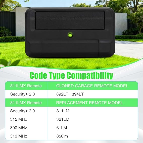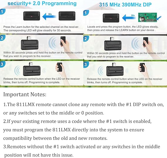 Q295 811LMX – Control remoto de puerta para Liftmaster, reemplaza a 811LM Liftmaster, interruptor Modelos compatibles con control remoto Liftmaster de 1.811LMX: el control remoto de apertura de puerta 811LMX es compatible con receptores LiftMaster 850LM / 860LM / STAR1000 y todos los abridores de puertas comerciales que utilizan cifrado de seguridad + 2.0. El mando a distancia 811LMX es compatible con todos los abridores de puerta Lift Master de 2016 a presentadores. . ¡Atención! El control remoto 811LMX liftmaster no es compatible con abridores de garaje. 2. Modelos reemplazables de control remoto 811LMX Liftmaster 811LMX recientemente actualizados: el control remoto de apertura de puertas 811LMX puede reemplazar los controles remotos liftmaster 811LM y 811LMX también incluye: controles remotos de puerta 361LM, 61LM y 61LMC y es compatible con controles remotos de aprendizaje 892LT y 894LT para clonación. Para tipos de código, solo compatible con productos comerciales Security+ 2.0, Security+ 390 MHz y Security+ 315 MHz. 3.811LMX Liftmaster Remote Seguridad mejorada: El reemplazo 811LMX para controles remotos Liftmaster cuenta con programación DIP dual de 12 bits, y el control remoto del abridor de puertas 811LMX ofrece hasta 4096 bits de codificación. La transmisión de banda estrecha de señales digitales encriptadas reduce la interferencia y mejora la seguridad. Los controles remotos de repuesto 811LMX Liftmaster son más seguros que los mandos remotos digitales cifrados estándar tradicionales. 4. Configuración de más códigos de control remoto 811LMX Liftmaster: Puede programar 0 o 50 mandos a distancia 811LMX 20 o 50 811LMX para receptores LiftMaster 811LM / 850LM / STAR1000 para comunidades cerradas o aplicaciones comerciales que requieren una gran cantidad de controles remotos para acceder a las entradas públicas. Por supuesto, si desea configurar más, simplemente copie la configuración de los controles remotos previamente programados con los nuevos controles remotos liftmaster. Enviamos a toda la republica pago contra entrega. Aceptamos tarjeta de crédito y debito.