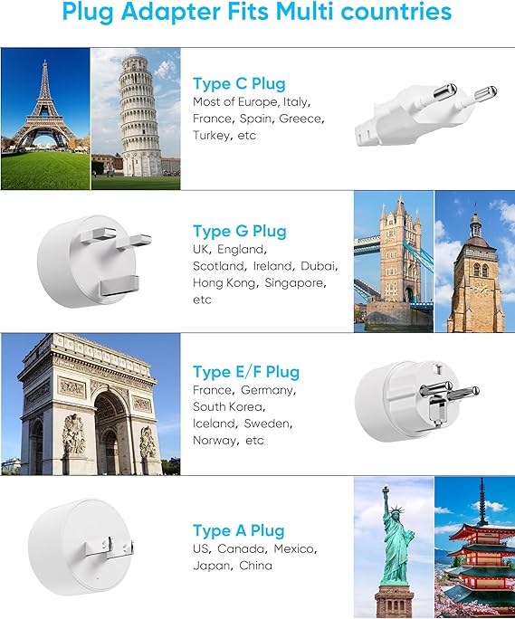 Q225 Adaptador de enchufe de viaje europeo, UE/Reino Unido/EE. UU., 6 salidas de CA, 4 puertos USB Adaptador de enchufe de viaje europeo 10 en 1 (no es un convertidor de voltaje), 6 salidas de CA, 2 puertos USB A y 2 puertos USB C, alimenta hasta 10 aparatos y dispositivos al mismo tiempo. El cable de extensión de 3 pies se puede envolver inteligentemente alrededor de la parte inferior de la regleta de alimentación. Fácil de almacenar, tamaño compacto (4.36 x 2.41 x 1.93 pulgadas), ligero, portátil de llevar, adecuado para un viaje de negocios y viajes Adaptadores europeos con USB C. Dos puertos USB A para cargar hasta 2.4A y puertos USB C para cargar hasta 3A Incluye 4 tipos de adaptadores internacionales: enchufes UE (tipo C), Reino Unido (tipo G), Alemania/Francia (tipo E/F), EE. UU. Japón (tipo B) compatibles con la mayoría del mundo Nota importante: Este adaptador no es un convertidor de voltaje, asegúrese de que su dispositivo admita doble voltaje (110V/220V), especialmente algunos aparatos eléctricos de alta potencia Enviamos a toda la republica pago contra entrega. Aceptamos tarjeta de crédito y debito.