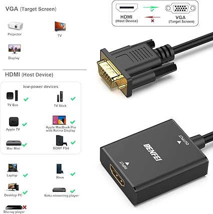 Q145 Adaptador HDMI a VGA, unidireccional, con conector de audio de 3.5mm, compatible con TV Stick Especialmente diseñado para TV sticks: este adaptador activo HDMI a VGA puede conectar un dispositivo compatible con HDMI a un monitor, proyector o TV compatible con VGA. Utiliza el cable HDMI 1.4 versión dentro de 26 pies para garantizar un alto rendimiento de este adaptador de TV Stick. Nota: su transmisión es unidireccional y solo transmite la señal de la fuente HDMI a la pantalla VGA. SINCRONIZACIÓN DE AUDIO COMPATIBLE – Viene con una salida independiente de audio de 3.5mm, audio externo, para lograr reproducción simultánea de audio y video. Puedes conectar al altavoz a través del cable de audio de 3,5 mm incluido. Incluye un puerto Micro USB, esencial para dispositivos con salida de baja potencia. ❗Si no estás seguro, intenta conectarte.❗ RENDIMIENTO INCREÍBLE – El convertidor HDMI hembra a VGA macho soporta resoluciones de hasta 1920×1080@60Hz (1080p Full HD) incluyendo 720p, 1600×1200, 1280×1024 para monitores o proyectores de alta definición; el conector HDMI chapado en oro resiste la corrosión y la abrasión y mejora el rendimiento de transmisión de señal; el alivio de tensión moldeado aumenta la durabilidad del cable. AMPLIA COMPATIBILIDAD – El adaptador HDMI-VGA es compatible con todas las computadoras de escritorio/portátiles/TV stick/Raspberry Pi/tablet PC/decodificador digital/cámara digital/cámara SLR/cámara de video que tienen puerto HDMI; el puerto VGA macho es compatible con todos los TV/monitores/proyectores/LCD y otras pantallas que están equipados con puerto VGA hembra.❗¡Asegúrese de identificar los dispositivos de baja potencia!❗ Enviamos a toda la republica pago contra entrega. Aceptamos tarjeta de crédito y debito.