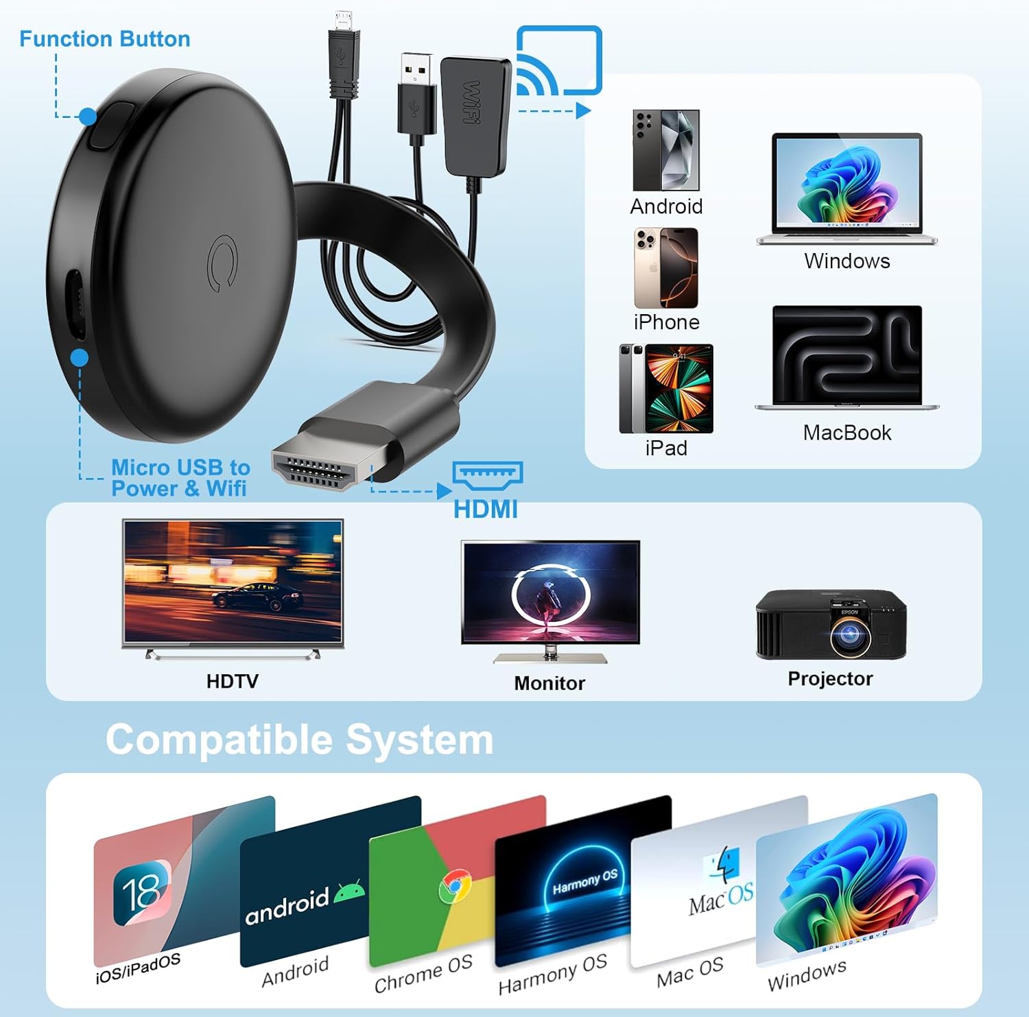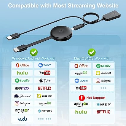 Q385.00 Adaptador inalámbrico HDMI para TV, sin demora 1080P, adaptador de espejo de pantalla extensor. Impresionante experiencia HD: este adaptador HDMI inalámbrico soporta calidad de imagen de 1080p/60Hz. Transmite señales de video con una resolución de 1920×1080p píxeles, actualizados 60 veces por segundo, proporcionando así una experiencia de reproducción de video/audio suave y clara. El dongle Miracast te permite sincronizar la pequeña pantalla de tu smartphone, tablet, portátil, computadora con la pantalla grande de tu TV, HDTV, monitor, proyector sin cables, y compartir cada momento vívido con tu familia. ✨【Transmisión confiable de doble banda 2.4/5G】Este adaptador Bluetooth HDMI para TV utiliza tecnología estándar de transmisión de 2.4G y 5GHz para una eficiencia de transmisión más rápida, más estable y una latencia minimizada. Con un alcance de transmisión de hasta 98.4 ft en espacios abiertos, el dongle inalámbrico le permite disfrutar de la transmisión inalámbrica desde prácticamente cualquier lugar de la habitación, perfectamente adecuado para las necesidades diarias de proyección de pantalla como cine en casa, aprendizaje electrónico, deportes de interior, presentaciones de conferencias y más. 💎【Modos de extensión y duplicación de pantalla inalámbrico】El modo de reflejo hace que sea fácil para el adaptador de pantalla inalámbrico HDMI proyectar audio, video, películas, imágenes, fotos, documentos, juegos y aplicaciones en la pantalla grande. Puede realizar múltiples tareas y ampliar su área de trabajo en modo extendido. El adaptador de monitor inalámbrico es perfecto para presentarlo en su monitor mientras continúa trabajando en su computadora portátil. 🌞【Simplicidad de conectar y usar】Ofrece una verdadera funcionalidad plug-and-play, el adaptador de pantalla inalámbrico Miracast es perfecto para principiantes y profesionales de tecnología por igual. Simplemente conecta el adaptador inalámbrico HDMI Bluetooth a tu televisor y enciéndelo, luego encuentra la función de duplicación en tu dispositivo para proyectar. El cable USB incluido requiere alimentación, y muchos televisores y proyectores modernos tienen un puerto USB cerca de la entrada HDMI, por lo que puede usar una batería si el puerto está ocupado. Amplia compatibilidad: el potente chipset del adaptador de pantalla HDMI inalámbrico garantiza la compatibilidad con una amplia gama de dispositivos de salida HDMI, así como con la mayoría de teléfonos inteligentes, computadoras, como iOS, Android, Windows y dispositivos macOS. El dongle HDMI para TV admite protocolos inalámbricos comunes como AirPlay, DLNA, Cast y Miracast. Nota: hdmi wireless no es compatible con algunas aplicaciones de pago que utilizan la protección de derechos de autor de video “HDCP”, como Netflix, Amazon Prime Videos, Hulu, Comcast TV, BT Sport y más. Tamaño mini, fácil de transportar: el adaptador de espejo de pantalla para TV cuenta con un diseño compacto y ligero que es solo del tamaño de la palma de tu mano, por lo que es ideal para usar como un sistema de presentación móvil en tu bolsillo o maletín. El cuerpo delgado y redondeado de la pantalla WIFI está diseñado para disipar el calor y mantener la transmisión constante incluso después de un uso prolongado. Lo que obtienes: 1 receptor HDML inalámbrico, 1 manual de usuario (idioma español no garantizado), 1 cable micro USB a USB y Wifi x 1. Si tienes algún problema al utilizar el adaptador de pantalla HDMI inalámbrico, ponte en contacto con nuestro equipo técnico profesional para obtener ayuda, proporcionamos un servicio de calidad de 24 meses. Enviamos a toda la republica pago contra entrega. Aceptamos tarjeta de crédito y debito.