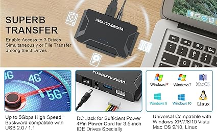 Q345.00 Adaptador USB 3.0 a SATA IDE, lector de disco duro, convertidor de ultra recuperación externo. ACCESO RÁPIDO A SATA IDE SSD & HDD: El adaptador de disco duro es compatible con SATA/IDE 2.5″/3.5″ SSD/HDD, unidad óptica CD DVD externa 5.25; Este adaptador nos permite recuperar los datos y moverlos a un disco duro en funcionamiento. con conector IDE de doble cabezal (40 pines y 44 pines) más un conector SATA II Supervelocidad de hasta 5 Gbps con USAP: el lector de disco duro IDE admite una velocidad de transferencia de datos de hasta 5 Gbps y soporta UASP. que es un 70% más rápido que el USB 3.0 tradicional y una reducción del 40% en los recursos de procesador requeridos, compatible con USB 2.0 / 1.1 ENORME SOPORTE DE CAPACIDAD DE 6TB: Diseñado para ser ligero y compacto. convertidor de recuperación de disco duro admite una capacidad de disco duro de hasta 6 TB de capacidad, Consejos: Algunos disco duro IDE es viejo, Para que pueda utilizar un disco duro IDE “único” de 3.5″, deberá configurar el puente en “esclavo” antes de encender el disco FUCCIONES ADICIONALES Y FÁCIL DE USAR: El adaptador USB 3.0 a IDE SATA incluye una fuente de alimentación de CA de 12V2A, para alimentar el uso de dispositivos IDE de 5V/12V, garantiza que el disco duro SATA se pueda conectar bien. El cable de alimentación de 4 pines está diseñado para una unidad IDE de 3.5 pulgadas; la luz LED muestra el estado de potencia y actividad SENCILLO RECONOCIDO: Con la funcionalidad plug-and-play, el adaptador de disco duro a USB elimina la necesidad de controladores adicionales o procedimientos de configuración complejos. Consejo: Windows solo puede reconocer (y asignar una letra de unidad a) unidades que están formateadas de manera compatible. Si esta es una unidad nueva, debe formatear CUBIERTA CON AMPLIA COMPATIBILIDAD: Puede utilizar unidades IDE, unidades SATA estándar, el adaptador USB a IDE SATA compatible con Windows 10/8.1/8/7/Vista/XP, Mac IOS y LINUX; Plug and play; soporte hot swap. Enviamos a toda la republica pago contra entrega. Aceptamos tarjeta de crédito y debito.