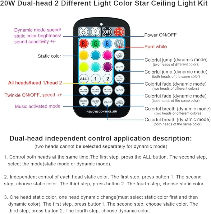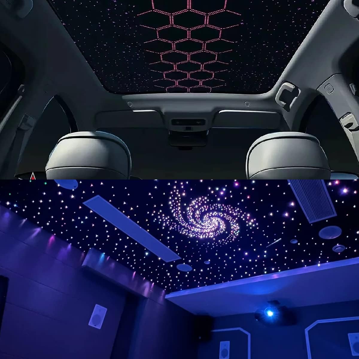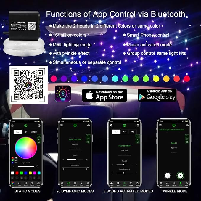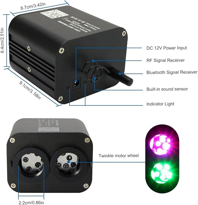 Q1375.00 AKEPO Kit de luz de fibra óptica de doble cabezal de 20 W, 750 piezas de hebras de fibra óptica. Kit de luz de fibra óptica de doble cabezal de 20 W de versión mejorada de diferentes colores de luz: controla los 2 cabezales de luz de forma dependiente o juntos por control remoto. Puedes hacer tu patrón de diseño especial con los 2 paquetes de fibra óptica, luego hacer que muestren diferentes colores al mismo tiempo o cambiarlos en un color fácilmente con el control remoto: ① Elige diferentes colores estáticos para las 2 cabezas. ② Haz las 2 cabezas en el mismo modo dinámico pero en diferentes cambios de color. ③Haz una de las cabezas en color estático y otra en modo dinámico. Motor de luz de doble cabezal RGBW: parpadeo + efecto activado por música: el motor de luz de doble cabezal AKEPO 20W RGBW puede instalar el doble de fibras ópticas que el motor de luz tradicional de un solo cabezal. Ambos dos cabezales pueden hacer más realista luz de cielo de estrella de fibra óptica con efecto parpadeante. Además, con sensor de sonido, cuando enciendes el modo activado por música/sonido y luego reproduces música, se puede activar siguiendo el ritmo del sonido. Control remoto+control de aplicación a través de Bluetooth: ① Control remoto: 10 colores estáticos (blanco puro, rojo, verde, azul, etc. )+3 tipos de modos dinámicos de 7 colores en monocromo o bicolor. Velocidad de centelleo de 4 niveles, brillo de color estático, velocidad de modo dinámico y sensibilidad de sonido ajustable. Haz la combinación de color/modos de las 2 cabezas con el botón “1”, “2” o “TODO”. ②Control de la aplicación: 16 millones de colores. Brillo, velocidad de centelleo y sensibilidad acústica ajustable. 20 modos dinámicos. 2 puertos controlan por separado. 【Especificaciones】Alto brillo. 1 control remoto + cable de fibra óptica de brillo final total 750 piezas en 9.8 pies, 2 paquetes de 375 hebras de fibra: 320 piezas x 0.03 pulgadas + 40 piezas x 0.04 pulgadas + 15 piezas x 0.06 pulgadas (bienvenido a personalizar otros tamaños de cable de fibra). Seguro: con adaptador de corriente para el hogar y enchufe de uso del automóvil, no es necesario conectar el cable y se puede utilizar para el hogar o el automóvil como quieras. Cable de fibra óptica impermeable para que no haya riesgo de descarga eléctrica (los motores ligeros deben mantenerse en un área seca). Con 2 años de garantía. Enviamos a toda la republica pago contra entrega. Aceptamos tarjeta de crédito y debito.