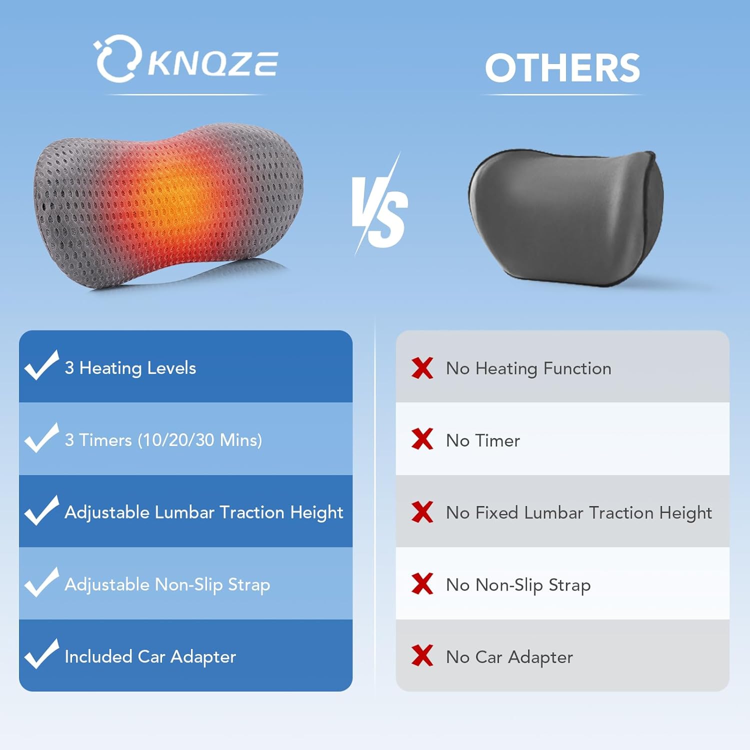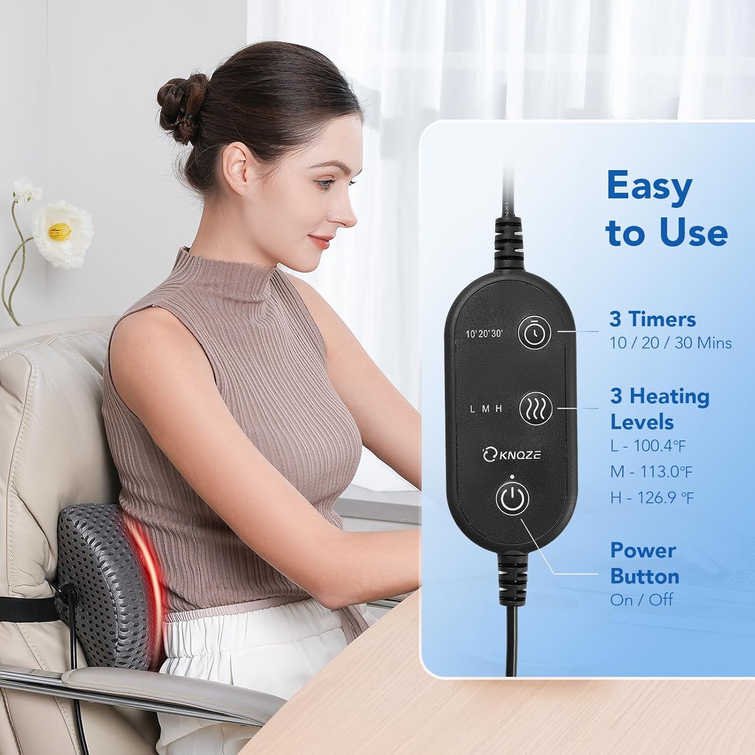 【Temperatura y temporizador ajustables】 La almohada de soporte para la espalda cuenta con 3 niveles de calor (bajo, medio, alto: 100.4 ~ 126.86 ° F) y 3 configuraciones de temporizador (10/20/30 minutos) para mejorar la circulación sanguínea, aliviar el dolor lumbar y reducir la fatiga. Personaliza la configuración para mayor comodidad. Nota: Evite el uso continuo; Limite las sesiones a 30 minutos. Incluye protección contra sobrecalentamiento: el calentamiento se detiene si está demasiado caliente y se reanuda después de enfriarse.