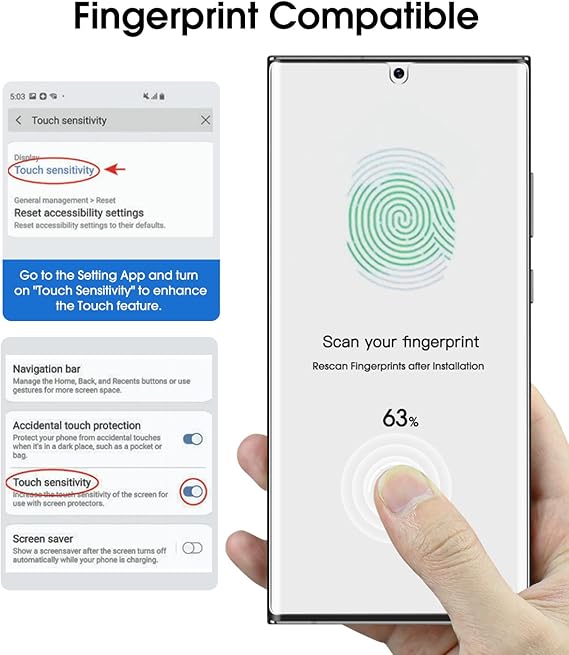 Totalmente compatible con el escáner de huellas dactilares UltraSonic: a diferencia de cualquier alternativa en el mercado, este protector de vidrio para Samsung Galaxy S22 Ultra funcionará completamente con el escáner de huellas dactilares ultrasónico. Simplemente vuelva a escanear su huella digital DESPUÉS de la aplicación. (Tenga en cuenta que los cuatro puntos alrededor del escáner se supone que deben estar allí. Son parte de la solución para permitir que el escáner de huellas dactilares funcione)