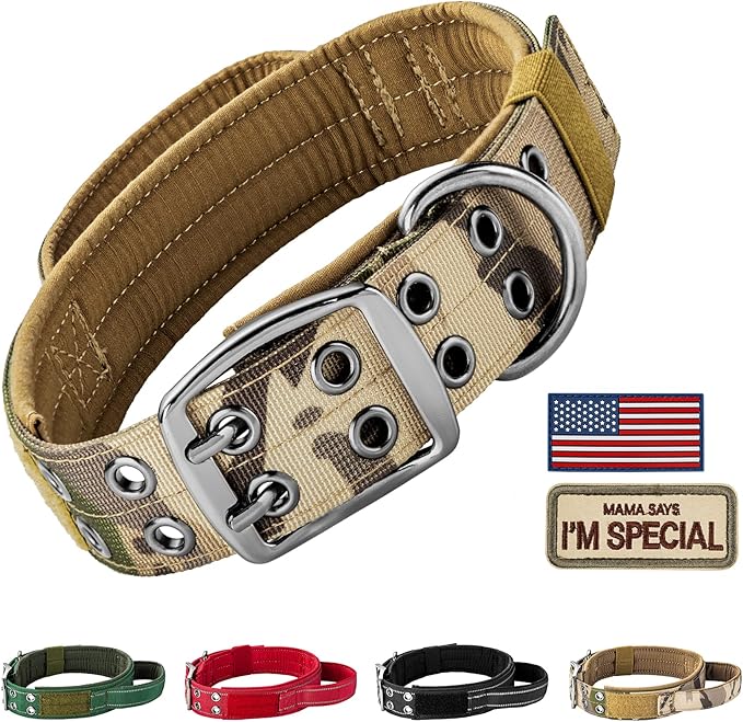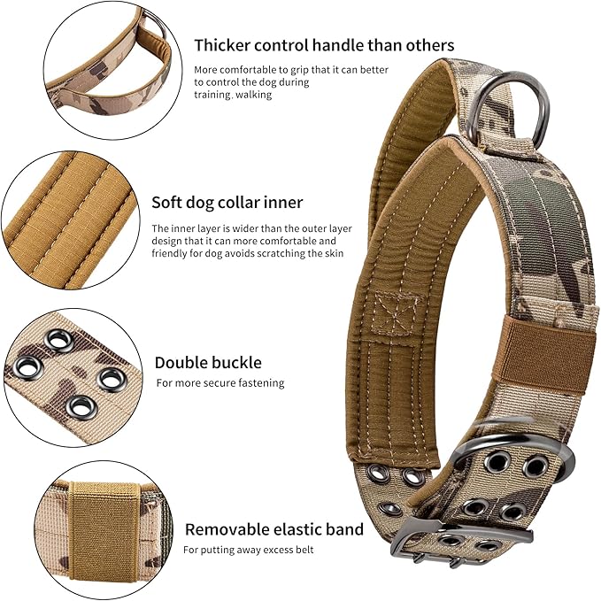Q265.00 Annchwool Collar táctico para perro mediano y grande, collar militar ajustable con mango acolchado. Material de alta calidad: nuestro collar de perro mediano y grande es de doble hebilla resistente y diseño de material grueso para una mejor fijación, el perro no es fácil de liberar. El interior acolchado suave más amplio es cómodo y agradable para el cuello del perro sin que el pelo del perro dañe. Mango de control grueso y suave: este mango de tráfico está hecho de material grueso y suave que puedes agarrar cómodamente y también puede ofrecer un mejor control para tu perro durante el entrenamiento del perro, patrullaje, salto, correr, acampar, senderismo, viajes o en zonas de alto tráfico. Diseño de área de velcro de parches: el collar táctico militar para perro con una zona de velcro, viene con 2 parches, puedes fijarlo en la zona de velcro del collar de perro para hacer que tu perro sea único. Elige el tamaño correcto: los collares para perro tienen tres tamaños, mide el cuello del perro y sigue la tabla de tallas para elegir el tamaño correcto. Para que el perro lo use cómodamente, se recomienda colocar 2 dedos más entre el cuello del perro y el collar del perro. Y los collares tácticos para perros son adecuados para perros medianos y grandes, como Pitbull, Gran Danés, Labrador, Golden Retriever, pastores alemanes, husky, pastores australianos, etc. Advertencia: buscamos diseñar collares de perro de alta calidad que a ti y a tu perro les encantará. Si tienes alguna pregunta, no dudes en ponerte en contacto con nosotros y te responderemos lo antes posible. Enviamos a toda la republica pago contra entrega. Aceptamos tarjeta de crédito y debito.