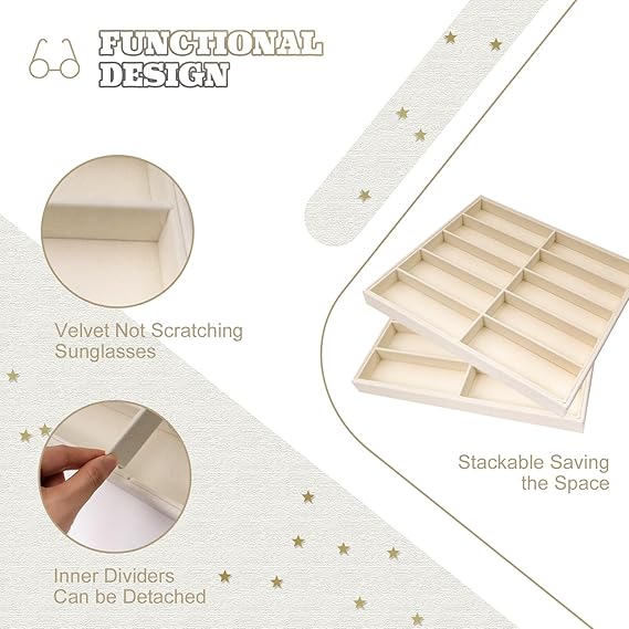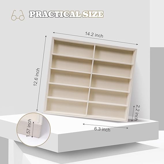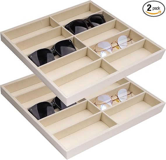 Q295 Bandeja organizadora de lentes de sol de 10 rejillas, 2 unidades, de terciopelo, color gris El paquete contiene: recibirás 2 organizadores de soporte para lentes de sol beige, cada uno tiene 10 rejillas, cantidad suficiente para satisfacer tus necesidades de almacenamiento diversificadas Suficiente espacio de almacenamiento: el tamaño de la caja organizadora de almacenamiento de lentes es de 14.2 x 12.6 x 1.57 pulgadas, la rejilla individual es de aproximadamente 6.3 x 2.2 x 1.57 pulgadas, protegiendo tus lentes de sol del polvo Material de calidad: el organizador de lentes de sol está hecho de terciopelo de calidad y tablero compuesto, no se deforma ni rompe fácilmente, la tela de terciopelo es suave al tacto, no raya tus lentes de sol Apilamiento y ahorro de espacio: la bandeja se puede apilar en su mesa de cosméticos o en el cajón sin ocupar demasiado espacio y ayudarlo a encontrar todo más fácil Adecuado para: Esta bandeja es ideal para guardar gafas, y también perfecta para calcetines, corbatas, joyas, cosméticos, carteras y más, lo que te ofrece más comodidad. Enviamos a toda la republica pago contra entrega. Aceptamos tarjeta de crédito y debito