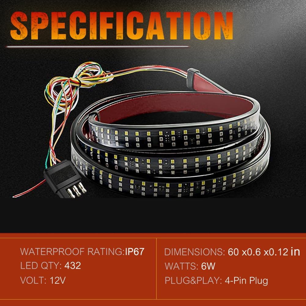 Súper brillante: barra de luz para portón trasero con 432 chips LED 3528SMD que hace que la salida de lúmenes sea un 300% más brillante que una o dos filas de barras de iluminación LED para portón trasero en coches. Añade una visibilidad clara a los conductores traseros, asegurando mejor tu seguridad en las carreteras. Adecuado para coche de 12 V y camioneta, como Tundra, Sierra, Silverado, Ram Pickup, Titan, etc.