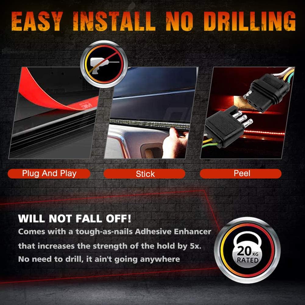Resistente al agua y apto para todo tipo de clima: cinta adhesiva fuerte y enchufe plano estándar de 4 pines bien conductivo que se pueden pegar fácilmente donde necesites. La barra de luz LED para portón trasero con tasa de impermeabilidad IP67, funciona bien en días lluviosos o nevados.