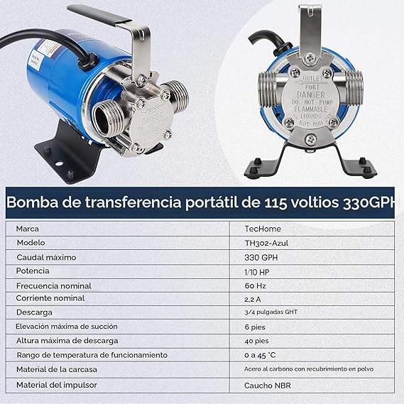 Bomba eléctrica de transferencia de agua: voltios/frecuencia: 115 V/60 HZ; Potencia: 1/10 HP; Velocidad de flujo máximo: 330 GPH; Descarga: 3/4 in.GHT; Elevación de succión máxima: 6 pies; Cabezal de descarga máximo: 40 pies; Puerto de descarga: 3/4 pulgadas; puerto de succión: 3/4 pulgadas. Esta es una bomba de transferencia no sumergible, así que no mojes el motor.