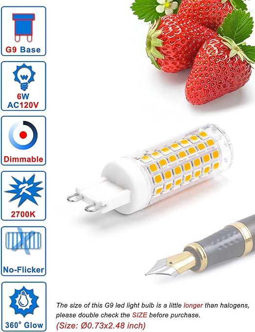 Q285.00 Bombillas LED G9 sin parpadeo regulables de 6 W, blanco cálido suave, 2700 K, 40 W, 50 W, 60 W. 【Aviso sobre el tamaño】Esta bombilla LED G9 de 6 W de color blanco cálido es de 0.7 x 2.48 pulgadas, es más larga que las bombillas halógenas G9, comprueba las dimensiones de tus accesorios antes de comprar. Aviso de tamaño por favor!! ! Ahorra factura de electricidad: esta bombilla LED regulable G9 de 6 W es lo suficientemente brillante como para reemplazar las bombillas halógenas G9 de 40 W, 50 W, 60 W, ahorrando más energía y dinero. Regulable, sin parpadeo y sin zumbido: las bombillas LED G9 regulables pueden ajustar la iluminación para que sea brillante o tenue, el rango de atenuación es más extenso. Compatible con la mayoría de los reguladores LED, sin parpadeo, también se pueden utilizar como bombillas no regulables. Amplias aplicaciones: la bombilla LED G9 de 2700 K de color blanco cálido es muy suave y cómoda y CRI>82 Ra, adecuada para todo tipo de accesorios G9: como candelabros de cristal colgantes, luz de ventilador de techo, aplique de pared, piso, mesa/lámparas de noche, luces de riel, luz colgante, downlight, debajo del armario, bombilla de luz de armario para reemplazar bombillas de sodio de alta potencia. Las bombillas LED G9 de color blanco cálido son ideales para usar en cocina, salas de estar, comedores, dormitorios, baños, luz de tocador y estudios, pasillos, entradas. Larga vida útil y no te preocupes por comprar: utilizamos chips LED y controlador de alta calidad y buen diseño de disipación de calor para nuestras bombillas LED G9 para garantizar 30,000 horas de vida útil. Enviamos a toda la republica pago contra entrega. Aceptamos tarjetas de credito y debito.