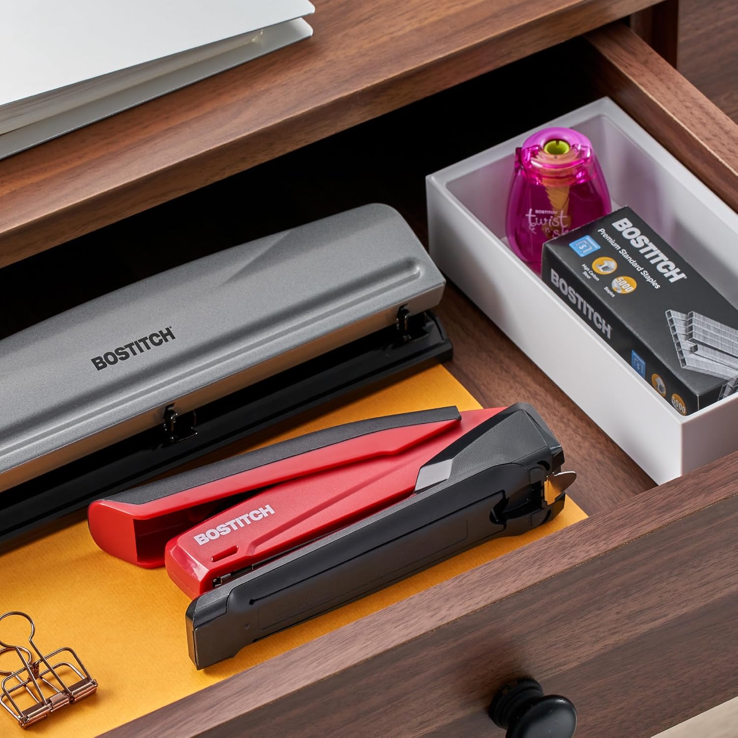 Q195.00 Bostitch Office Executive – Engrapadora 3 en 1 (no incluye grapas). El grapado de un dedo de PaperPro requiere un 80 % menos de fuerza Tecnología sin atascos para un grapado suave y sin complicaciones Engrapa con facilidad hasta 20 hojas Se abre 180 grados para fijar o hacer manualidades Removedor integrado para una cómoda extracción de grapas Almacenamiento oculto de grapas Se coloca horizontal o verticalmente para ahorrar espacio en el escritorio Enviamos a toda la republica pago contra entrega. Aceptamos tarjeta de crédito y debito.