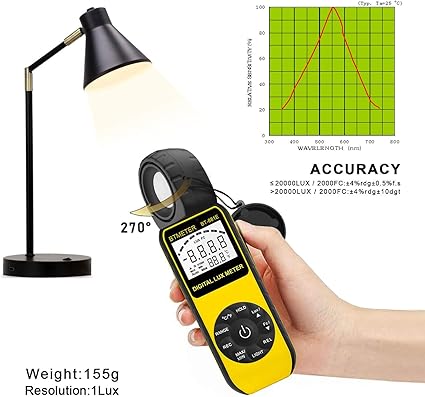 Q385 BTMETER BT-881E Medidor Digital de Iluminancia/Luz, Mide Luces de 0.01~300,000 Lux (0.01~30,000 FC) ☀【Alta precisión】+/- 4% lecturas +/- 0.5% f.s (10,000 Lux; 1,000 FC); +/- 5% lecturas +/- 10 dígitos (300,000 Lux; 30,000 FC) ☀【RESPUESTA DE 0.4 SEGUNDOS】Muestreo de 2 a 3 veces por segundo, mide instantáneamente cuánta luz estás recibiendo ☀【AMPLIO RANGO DE MEDICIÓN】 Este medidor de luz puede medir la luminancia a 0.01~300,000 lúmenes (0.01~30,000 candelas por pie), lo cual es mucho más amplio que los demás. Resolución 0.01 ☀【Fácil de usar】El sensor de luz se puede girar 270º, por lo que no es necesario girar alrededor del medidor de luz para medir las luces desde diferentes ángulos. Solo gira el sensor, y aún puedes leer la medida en la parte frontal ☀【MEMORIZAR LAS LECTURAS DE LUZ】Este medidor de luz puede ayudarte a grabar 33 juegos de lecturas, pruebas de temperatura, el modo de medición relativo te mostrará la diferencia entre los datos actuales y grabados. Ideal para usar en casa, jardín, acuario, plantas, escuela, oficina, luces LED, interiores y exteriores. Enviamos a toda la republica pago contra entrega. Aceptamos tarjeta de crédito y debito.