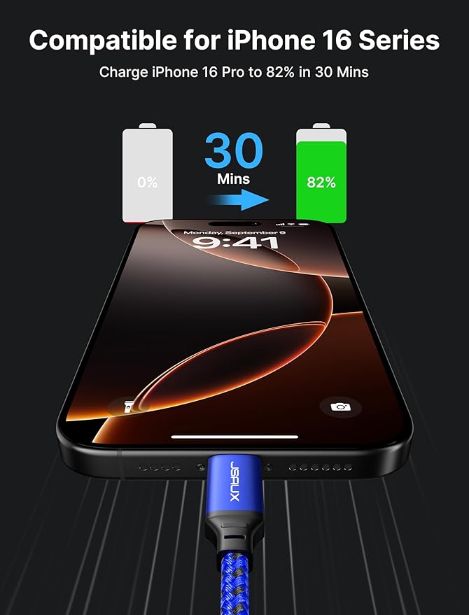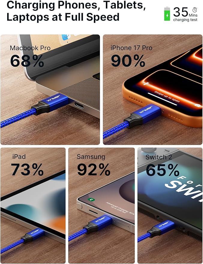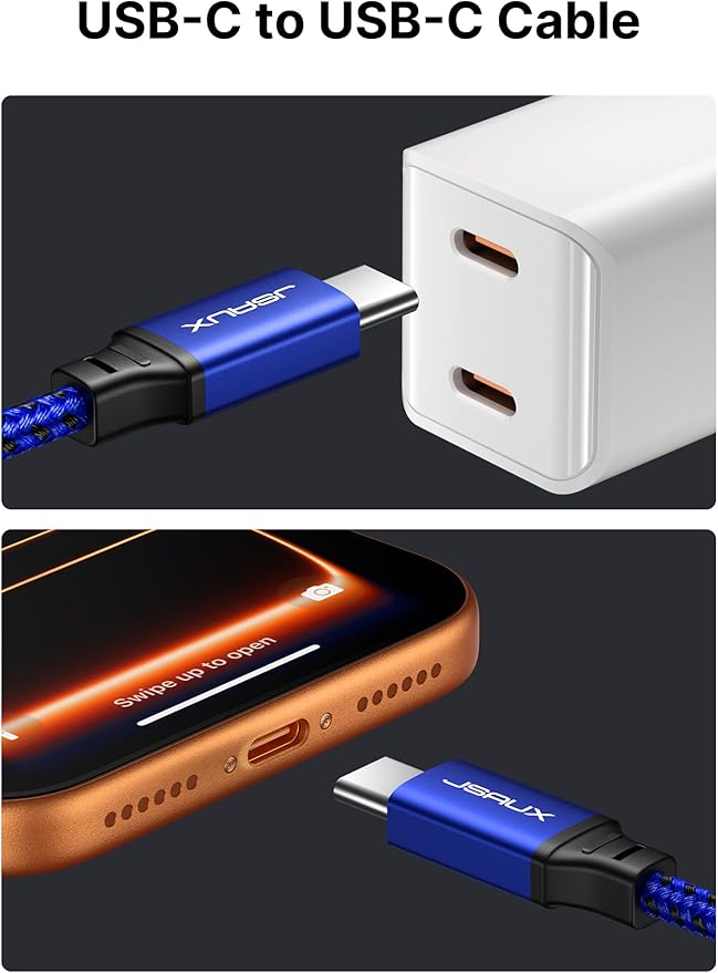 Compatibilidad perfecta: cable USB C a C JSAUX compatible con prácticamente todos los dispositivos USB C, incluidos teléfonos, tabletas y computadoras portátiles. Como MacBook Air/Pro, iPhone Air/iPhone 17/iPhone 17 Pro/iPhone 17 Pro Max, iPhone 16e/iPhone 16/16 Plus/16 Pro/16 Pro Max, iPhone 15/15 Plus/15 Pro/15 Pro Max, Galaxy S25 Ultra/S25+/S25/S24 Ultra/S24+/S24/S23 Ultra/S23 +/S23/S22 Ultra/S22+/S22/S21 Ultra/S21+/S21/S20/S20+/S20 Ultra/Note 20, Pixel Series, iPad Mini 6, Steam Deck, Switch 2, Switch OLED/Lite y más dispositivos con puerto USB C.