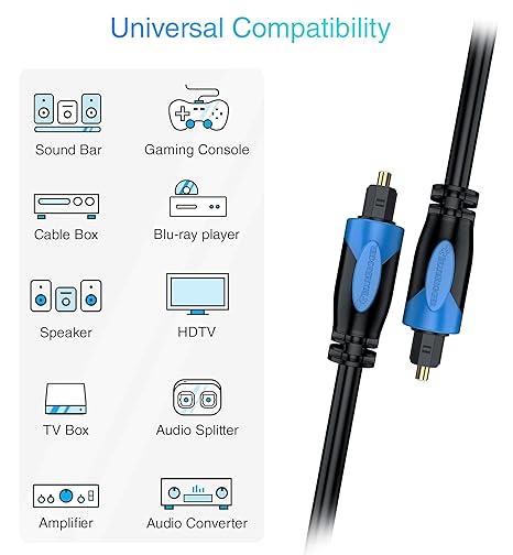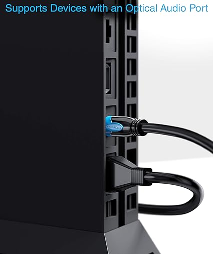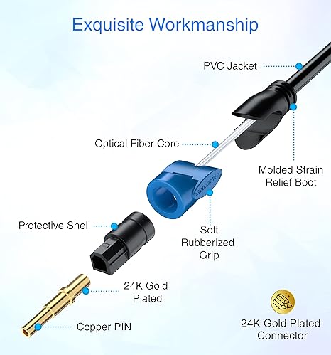 Cable óptico digital fabricado con una capa exterior de PVC negro resistente y conectores chapados en oro resistentes a la corrosión para una transferencia de señal óptima.