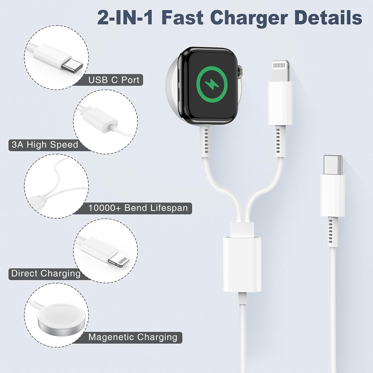 cable USB C 2 en 1 para iWatch y iPhone, cable de carga rápida de 6 pies con cargador de pared rápido de 20 W para Apple Watch Series 10/9/8/7/6/5/SE y iPhone14/13/12/AirPods