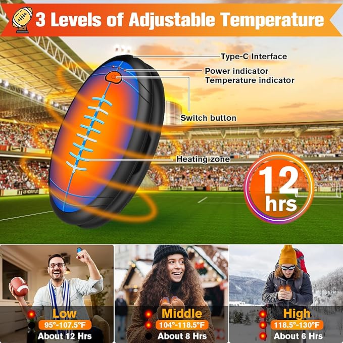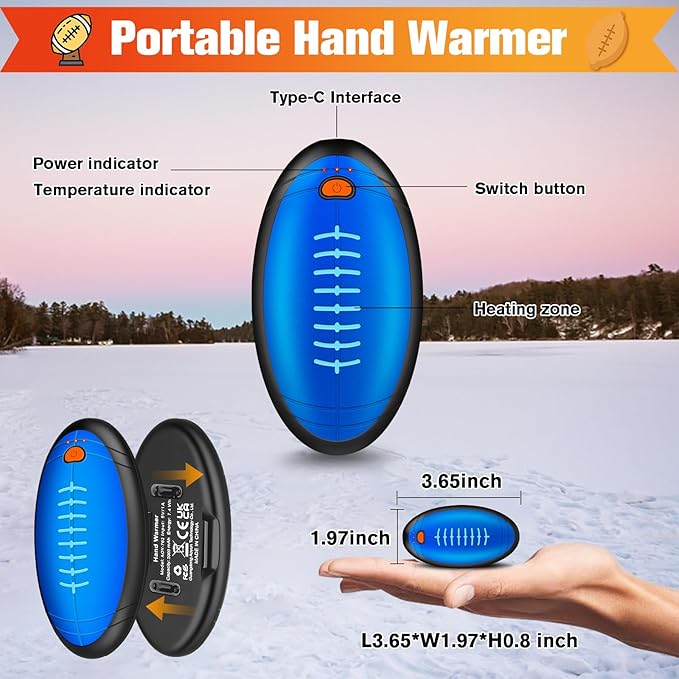 Diseño cómodo y portátil: el calentador de manos 2 en 1 tiene un aspecto elegante, una forma de pelota de rugby para una fácil sujeción y un diseño ergonómico para mantenerte caliente cómodamente. Este calentador de manos USB del tamaño de la palma cabe en guantes o bolsillos. Perfecto para viajar, cazar, acampar, pescar, ver el juego, esquí y más. El calentador de manos portátil también puede calentar ciertas partes del cuerpo para eliminar la fatiga y aliviar el dolor de espalda baja, especialmente adecuado para los viejos hombre, niños y oficina personal.