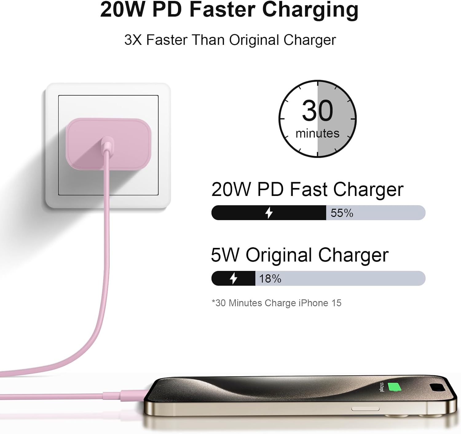Cargador rápido PD 3.0 de 20 W: cargador rápido PD 3.0 de 20 W y cable USB-C a C de 10 pies, carga el iPhone 16 de 15 a 55% en media hora, que es 3 veces más rápido que con un cargador original de 5 W