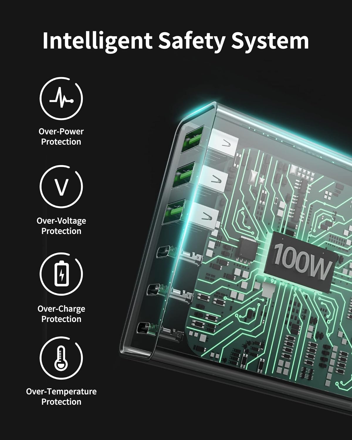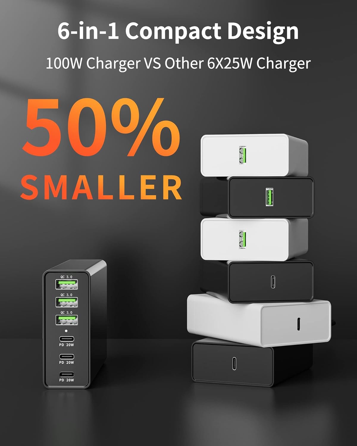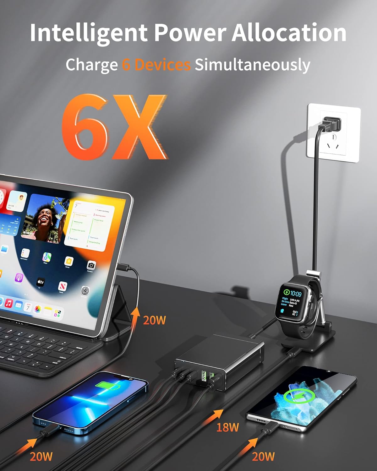 100 W de potencia para cargar rápidamente todos los dispositivos USB-C a la máxima velocidad. Solo 30 minutos para cargar completamente el iPhone o hasta 6 teléfonos simultáneamente.