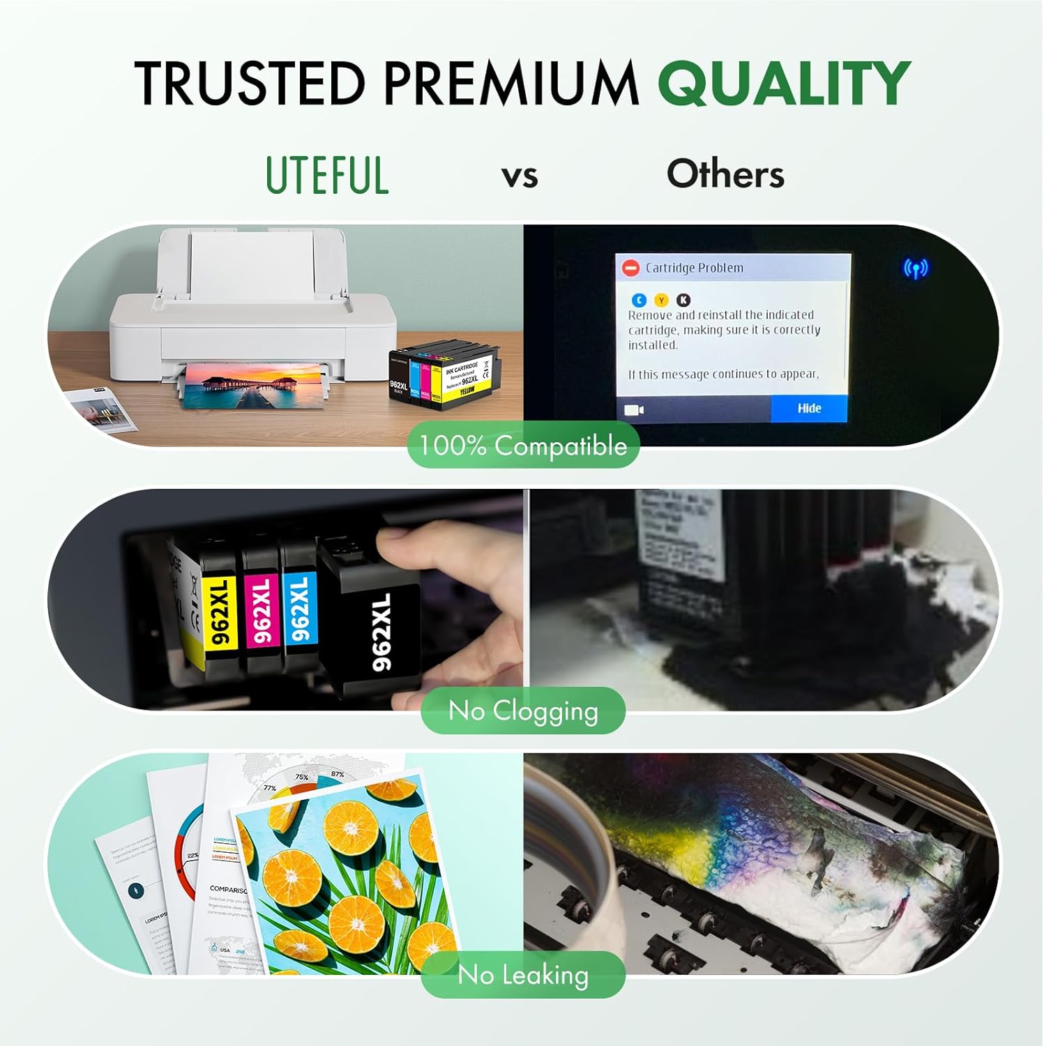 Q495.00 Cartucho de tinta compatible de repuesto para HP 962XL (negro, amarillo, cian, magenta, 4 unidades) Impresora 100% Compatibilidad: Compatible con impresora HP OfficeJet Pro 9010 9012 9015 9016 9018 9019 9020 9025. ¡Nota! ! ! :No es compatible con impresoras que activaron el servicio HP+ y no es compatible con impresoras de la serie *e (como 9015e 9025e). Confirma las impresoras compatibles antes de realizar el pedido. Alto rendimiento de páginas: 2000 páginas por cartucho de tinta negra 962xl, 1600 páginas por cartuchos de tinta de color 962xl, cobertura del 5% en papel A4. Calidad superior: este paquete combinado de cartuchos de tinta 962xl de alto rendimiento está convenientemente equipado con los últimos chips y boquillas antiobstrucción de alta calidad para evitar obstrucciones. Proporciona texto y gráficos claros, imprimiendo cada metro que desee en papel. Contenido del Paquete: Paquete de 4 cartuchos de tinta remanufacturados de repuesto para HP 962xl(1 Negro, 1 Cian, 1 Magenta, 1 Amarillo) Aviso 1: Antes de comprar, compruebe cuidadosamente con su modelo adaptable de impresora y compre el modelo de cartucho de tinta correspondiente; Aviso 2: Si compra la pregunta incorrecta u otra pregunta, no dude en ponerse en contacto con nosotros primero a través de Amazon, nuestro servicio posventa de calidad le dará una solución satisfactoria dentro de las 12 horas. Enviamos a toda la republica pago contra entrega. Aceptamos tarjeta de crédito y debito.