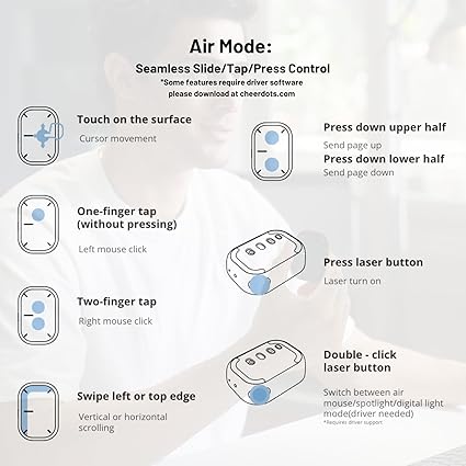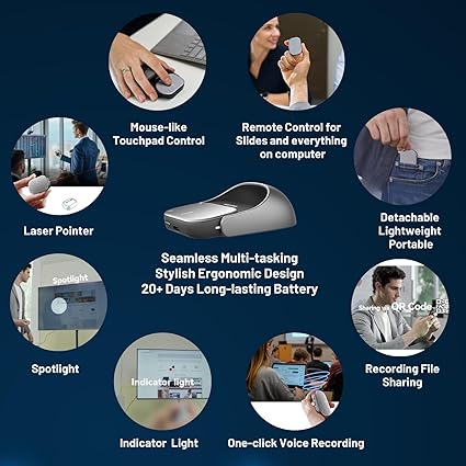 Q520 Cheerdots Ratón de aire desmontable Bluetooth con panel táctil con grabación de voz, control remoto TENGA EN CUENTA: El estilo de grabación no es de estilo avanzado. 【Mouse de aire desmontable multifuncional único】El mouse Cheerdots2 Air viene con un elegante diseño magnético desmontable. Es un mouse de aire, panel táctil inalámbrico, clic de presentación y bolígrafo de grabación, todo en uno. Su forma ergonómica mejorada se adapta perfectamente a tu mano y responde a los movimientos naturales de la mano. Con un peso de solo 2.47 oz, puedes llevarlo en tu bolsillo para usarlo sobre la marcha. 【Clicker de presentación definitivo con puntero láser】Cheerdots2 Air Mouse es un asistente ideal para tener en tu sala de reuniones, aula o conferencia. Ofrece dos modos de operación: modo de escritorio y modo aire. En modo de escritorio, sirve como un mouse de aire regular con funciones adicionales de touchpad. En modo aire, se transforma en un controlador de dispositivo inteligente portátil y un clicker remoto de presentación profesional con dos opciones de resaltado de contenido. Puede tocar o deslizar la superficie para mover el cursor, deslizar el lado para voltear las páginas de su presentación y cambiar entre el foco y la luz digital para resaltar lo que está diciendo. Puntero láser de larga distancia: al presionar el botón láser, el dispositivo puede liberar fácilmente un láser rojo intenso para atraer más atención a tus presentaciones y conferencias. Conectividad Bluetooth y batería de larga duración: Cheerdots2 se puede conectar a Bluetooth en un flash y tiene una larga duración de la batería. Está equipado con un puerto de carga tipo C, una sola carga se puede utilizar durante 20 días, lo que es muy adecuado para su uso sobre la marcha. Compatibilidad de software: el software de controlador es compatible con MacOS10.15+ y Wins10/11. Enviamos a toda la republica pago contra entrega. Aceptamos tarjeta de crédito y debito.