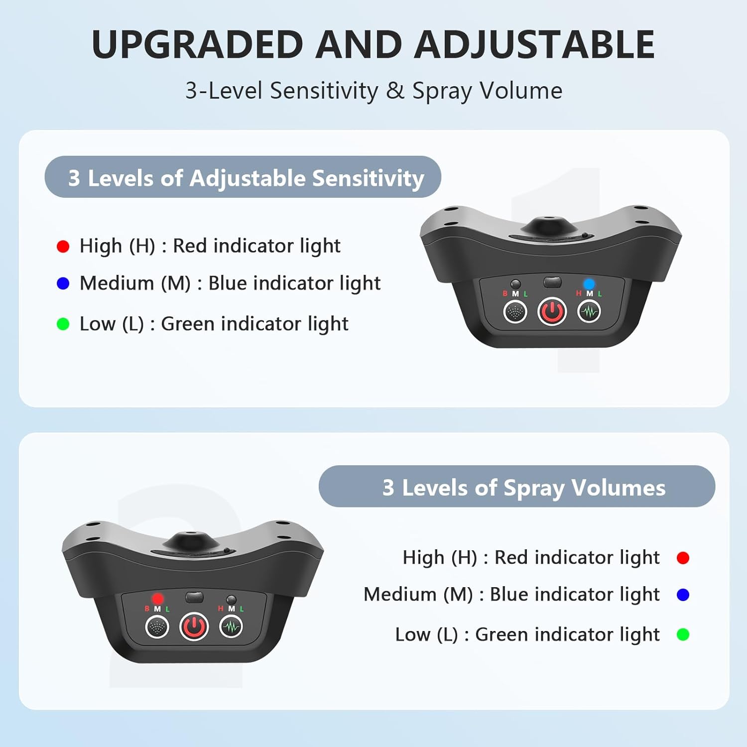 - [3 niveles de sensibilidad y volumen de pulverización de 3 niveles] Nuestro collar de corteza de perro de citronela mejorado viene con 3 niveles de sensibilidad y volúmenes de pulverización. Puedes ajustar la sensibilidad del collar antiladridos para que coincida con los ladridos de tu perro y el medio ambiente. También puedes configurar el volumen de pulverización de collares sin ladridos para perros para lograr un mejor efecto de entrenamiento.