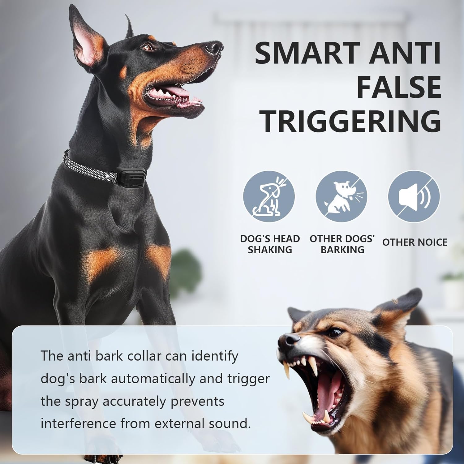 - Tecnología inteligente y sin disparadores falsos: el collar automático de ladridos adoptado con sensor inteligente mejorado y chip premium, detección más precisa de los ladridos de tu perro, mientras filtra otros sonidos irrelevantes u otros sonidos de perros para evitar falsos disparos. El collar antiladridos tiene 1 aviso de pitido, solo ladrar dos veces o más en 10 segundos activará el aerosol.