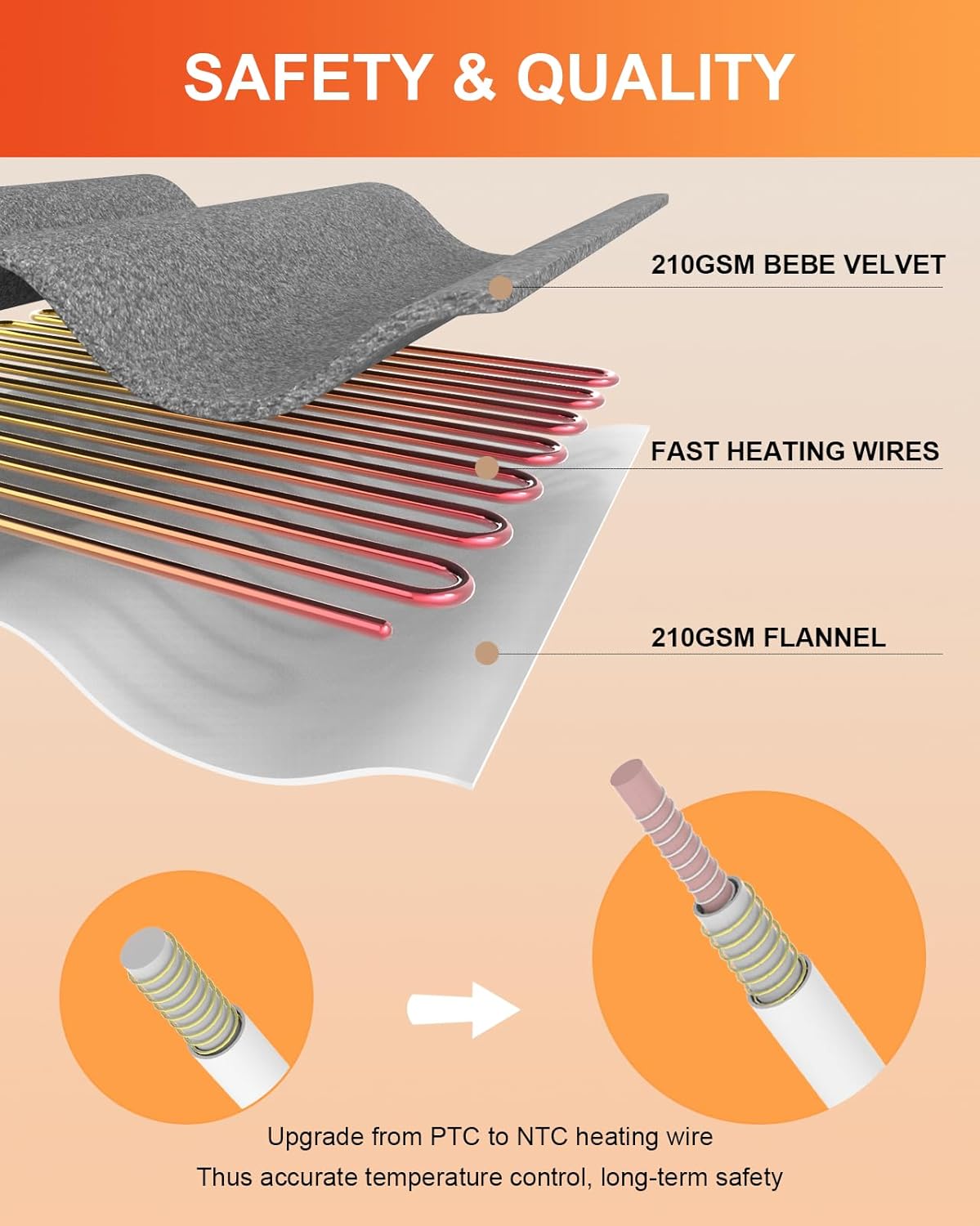 Calor seguro y uniforme: la manta térmica Comfytemp está estrechamente dispuesta con cables calefactores, por lo que la distribución del calor es más uniforme. Tiene 3 niveles de calefacción con un rango de temperatura de 104°F-140°F. Diseño con un solo clic para facilitar su uso, incluso para ancianos, enfermos y discapacitados. Además, nuestra manta térmica tiene un sistema de protección NTC contra sobrecalentamiento, sobrecarga y fugas de tierra que apaga automáticamente la manta en caso de falla, lo que las hace seguras para uso durante toda la noche.