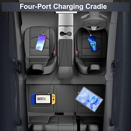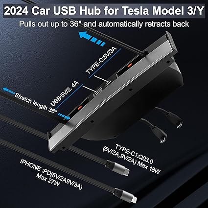 Estación de acoplamiento retráctil USB compatible con Tesla Model 3/Y (2021–2023), que ofrece carga rápida PD y puertos USB Tipo-C para una integración perfecta en la consola central.