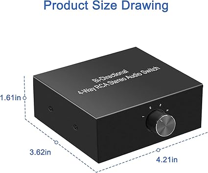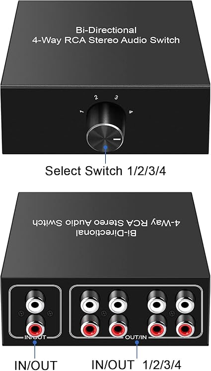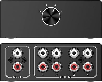 Q395 Conmutador de audio bidireccional de canal de sonido L/R estéreo de 4 vías, 1 en 4 salidas o 4 en 1 Conmutador de audio estéreo RCA L/R 4 EN 1 OUT o 1 IN 4 OUT. Funciones principales: (1) seleccione la entrada de audio entre 1/2/3/y 4 con tamiz de perilla y obtenga una salida; (2) seleccione la salida de audio entre 1/2/3/y 4 para recibir una entrada Adecuado para múltiples fuentes de selección de señal o amplificador paralelo multisala o distribución activa de altavoces de la misma reproducción de señal. Utilice un interruptor giratorio de audio especializado/dispositivo sin pérdida, cambie fácilmente entre diferentes entradas o salidas de audio. Caja de interruptor estéreo con señal sin pérdida, caja de aluminio resistente antiinterferencia, distribuidor de conector compacto RCA L/R Cajas divisoras estéreo. Plug and play, no necesita energía, no afecta la calidad del sonido. Enviamos a toda la republica pago contra entrega. Aceptamos tarjeta de crédito y debito.