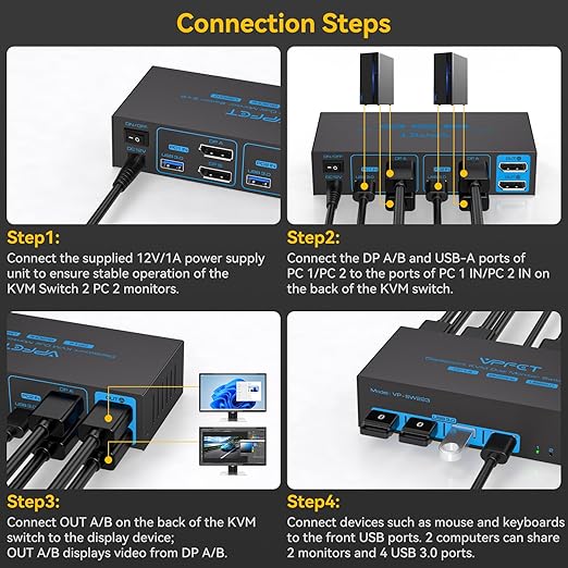 Q765.00 Conmutador KVM Displayport de 8K a 60Hz (sin cables) Conmutador KVM de doble monitor Displayport: el conmutador KVM DP permite que dos computadoras o portátiles compartan dos monitores y cuatro dispositivos USB, que pueden manejar múltiples monitores sin esfuerzo, ya sea que esté trabajando en una oficina en casa o en un entorno profesional, este conmutador KVM proporciona una conmutación perfecta y una mayor productividad. Nota: Asegúrese de que su computadora tenga dos puertos DP y que todos los monitores tengan un puerto DP. Se recomienda que todos los cables no superen los 4.9 ft 【Modo KVM extendido y copia de 8K】: el KVM DisplayPort admite una experiencia visual de hasta 8K60Hz y 4K120Hz, y es compatible con resoluciones como 2K144Hz y 1080P. El modo extendido le permite mover la ventana de la aplicación a otra pantalla, proporcionando un amplio espacio de trabajo para una multitarea eficiente. El modo de copia copiará la imagen de la pantalla principal a la pantalla secundaria, adecuada para presentar su PPT u otras obras.Tenga en cuenta: asegúrese de que el ordenador admita los modos extendidos y de copia Fácil de cambiar: la luz indicadora muestra el canal activo y le permite cambiar entre dos computadoras con solo presionar un botón. Además del interruptor de botón en la unidad, hay un botón de extensión por cable separado que le permite moverlo a donde lo necesite, y puede colocarlo en un área conveniente para cambiar entre dispositivos. O puede colocarlo debajo de su escritorio, lo que puede hacer que sea un escritorio más limpio y vacío. Nota: No se admiten accesos directos de teclado (teclas de acceso rápido) KVM USB 3.0: además del mouse y el teclado, el puerto USB adicional permite que los dos sistemas compartan impresoras, unidades flash USB y otros dispositivos. Velocidad de transferencia de interfaz USB 3.0 de hasta 5 Gbps, ahorrando tiempo de transferencia de datos, para que el dispositivo USB a la fuente de la conexión sea más suave, compatible con USB 2.0. Nota: asegúrate de que cada computadora esté conectada al KVM. usando un cable USB para conéctese al KVM, de lo contrario el dispositivo USB no será reconocido Compatibilidad y mano de obra: este conmutador KVM es resistente, silencioso, compacto, a prueba de caídas, disipación de calor, tiene una carcasa de metal, bien hecha, y la fuente de alimentación de 12 V/1 A CC proporciona suficiente energía para que el interruptor funcione de manera más estable. Y puede ser compatible con muchos sistemas operativos, como Windows 7/10/8/8.1/7/Vista/XP, Linux y Chrome OS Servicio posventa: podemos entregar el producto al cliente en un corto período de tiempo, y también ofrecemos un servicio de reemplazo si el equipo se vuelve anormal dentro de los 24 meses de uso. Si tienes alguna pregunta, ponte en contacto con nosotros en cualquier momento, te daremos la respuesta más profesional, te daremos una experiencia de compra satisfactoria Enviamos a toda la republica pago contra entrega. Aceptamos tarjeta de crédito y debito.