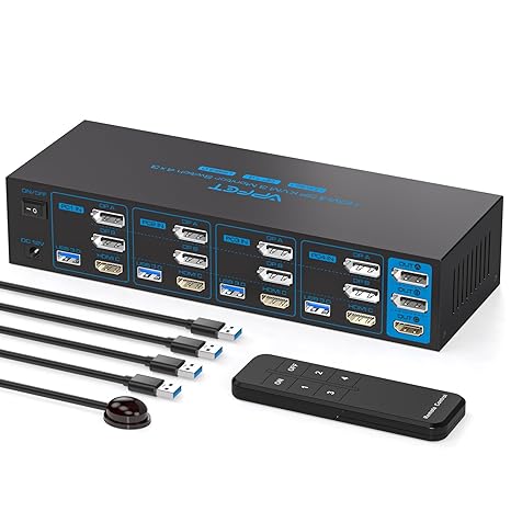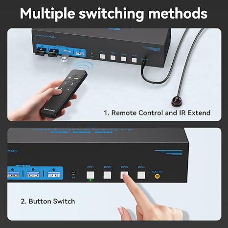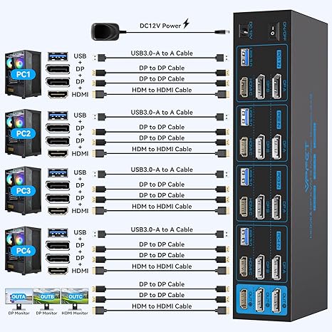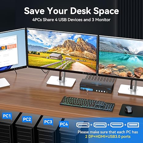 Q1620.00 Conmutador KVM HDMI de 8K + 2 Displayport, 3 monitores, 4 computadoras 4K144Hz. Conmutador KVM de 4 computadoras: el interruptor KVM de puerto de pantalla HDMI permite que 4 PC o portátiles compartan 3 monitores y 4 dispositivos USB como teclados, mouse, impresoras, escáneres, memorias USB, etc. Para los usuarios con 4 PC, esta es una excelente manera de ahorrar dinero y espacio. Nota: Cada computadora debe estar equipada con 2 puertos DP y 1 HDMI para un funcionamiento adecuado; el uso de cables o adaptadores de conversión puede resultar en transmisiones erráticas/parpadeantes o fallas para transmitir imágenes (el dispositivo se desconectará intermitentemente) Control de conmutación: el interruptor KVM utiliza botones en el panel para controlar la conmutación. También admite conmutación de control. 1. Los 4 botones en el cuerpo que le permiten cambiar de PC1 a PC4 instantáneamente sin tener que presionarlo dos veces; 2. El controlador le permite cambiar de computadora a voluntad, lo que le permite ocultar el conmutador KVM y hacer que su escritorio esté más ordenado. Este es un gran diseño para las personas que les gusta aprovechar al máximo su espacio y les gusta organizarse. HDMI 2.1 y DP 1.4: el conmutador HDMI Displayport KVM de 3 puertos soporta resolución Ultra HD de hasta 8K a 60Hz y es compatible con versiones anteriores de 4K a 144Hz, 4K @120Hz y 1080P @240Hz, que representa con precisión detalles y dinámicas sutiles para una fiesta visual más precisa y exitosa. Nota: Se recomienda utilizar un cable estándar DP 1.4 y HDMI 2.1 de alta calidad con una longitud de no más de 3.3 pies para un funcionamiento más estable y evitar pantallas negras Conmutador KVM USB 3.0 más estable: el conmutador KVM de 3 monitores está configurado con cuatro puertos USB 3.0. Se puede conectar al teclado, ratón, impresora, escáner, unidad flash USB, etc. La velocidad de transferencia máxima es de hasta 5Gbps y es compatible con USB 2.0 y 1.1. USB 3.0 soporta intercambio en caliente para proteger mejor los dispositivos y datos de daños. (Nota: Cada computadora debe estar conectada con un cable USB 3.0 al conmutador KVM, de lo contrario no se reconocerán los periféricos USB) 【Máxima compatibilidad y estabilidad】El conmutador KVM es compatible con la mayoría de las principales marcas de computadoras y monitores del mercado, compatible con sistemas informáticos como Windows/XP/MacOS/Linux, etc. El adaptador de alimentación de 12V proporciona una unidad más fuerte para el KVM para garantizar una transmisión estable. Si encuentra algún problema durante el uso, puede enviarnos un correo electrónico a través del número de pedido. Dentro de 24 meses, reemplazaremos el interruptor sin cargo. Enviamos a toda la republica pago contra entrega. Aceptamos tarjeta de crédito y debito.