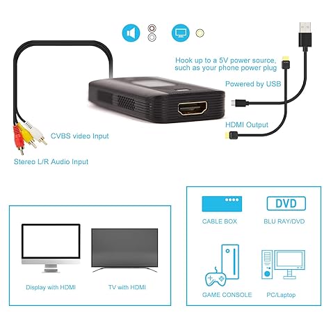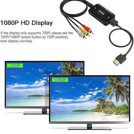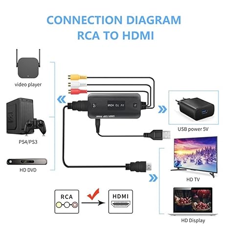 Q285.00 Convertidor RCA a HDMI, adaptador compuesto macho AV compatible 1080P PAL/NTSC compatible. Convertidor RCA a HDMI macho: señales de video compuestas AV (CVBS) y señales de audio estéreo FL/FR en señales digitales HDMI, por lo que DVD, cámaras de video y otras señales de audio y video compuestas a salida de señal HDMI HD, fácil de conectar el televisor LCD, pantalla de alta definición, etc. Amplia compatibilidad: convertidor AV a HDMI audio compuesto y video (CVBS) a HDMI rojo, amarillo y blanco Lotus a HDMI, compatible con el estándar de entrada de video: PAL, NTSC3.58, NTSC4.43, SECAM, PAL / M, PAL / N. Compatible con protocolo HDCP. Tenga en cuenta que el conector RCA de este convertidor es macho. Salida Full HD 720P/ 1080P: este convertidor de salida RCA en HDMI puede detectar y convertir automáticamente señales RCA en HDMI 720P/ 1080P, proporciona un procesamiento avanzado de señal con gran precisión, colores, resoluciones y detalles. Puede seleccionar la resolución de salida mediante el botón del interruptor en el convertidor. Cables HDMI y RCA incluidos: todos los cables están incluidos en el paquete, sin necesidad de comprar cables adicionales. Cable convertidor RCA a HDMI todo en uno rentable. La lista de paquetes de este adaptador RCA HDMI contiene: 1x convertidor compuesto a HDMI, 1x cable RCA, 1x cable HDMI, 1x cable de alimentación USB. 【Compra sin preocupaciones】Plug and Play, fácil de instalar y operar, alimentado por cable USB externo. Si tiene alguna pregunta sobre este convertidor RCA a HDMI, no dude en ponerse en contacto con nosotros. Enviamos a toda la republica pago contra entrega. Aceptamos tarjeta de crédito y debito.