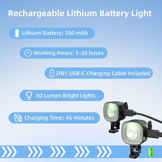 - Linternas recargables originales: ¡Debido a la batería de litio incorporada, puede ahorrar toneladas de batería! Simplemente carga las luces a través del cable USB C incluido antes de usar. Mientras se carga, la luz indicadora verde parpadea. Cuando se ha cargado durante 40-60 minutos, se volverá verde sólido, lo que significa que está completamente cargado.