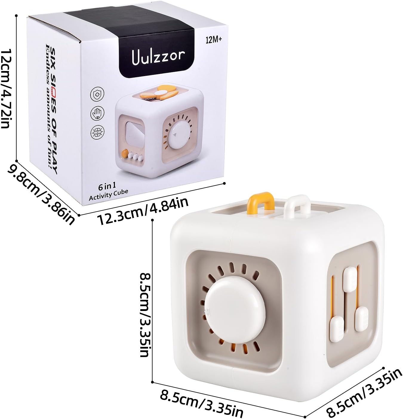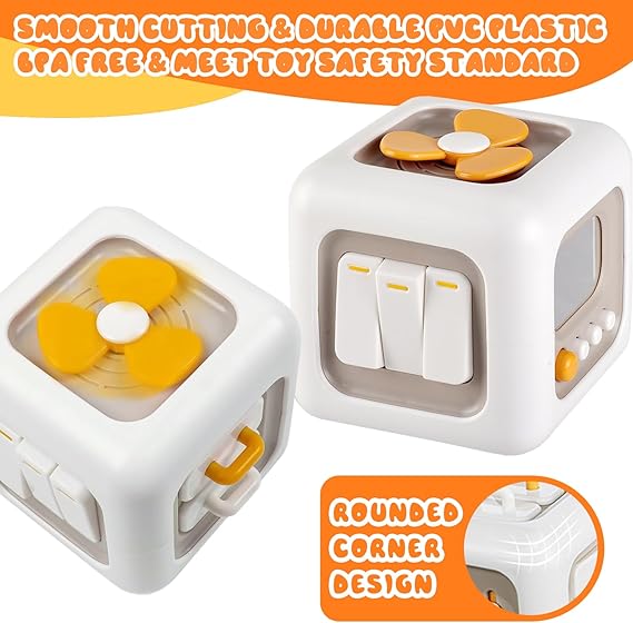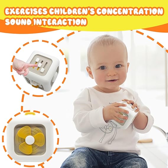 Cubo LED de madera natural con luces y botones, diseñado para estimular habilidades sensoriales y motoras en niños mayores de 1 año.