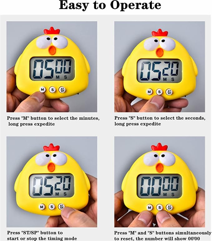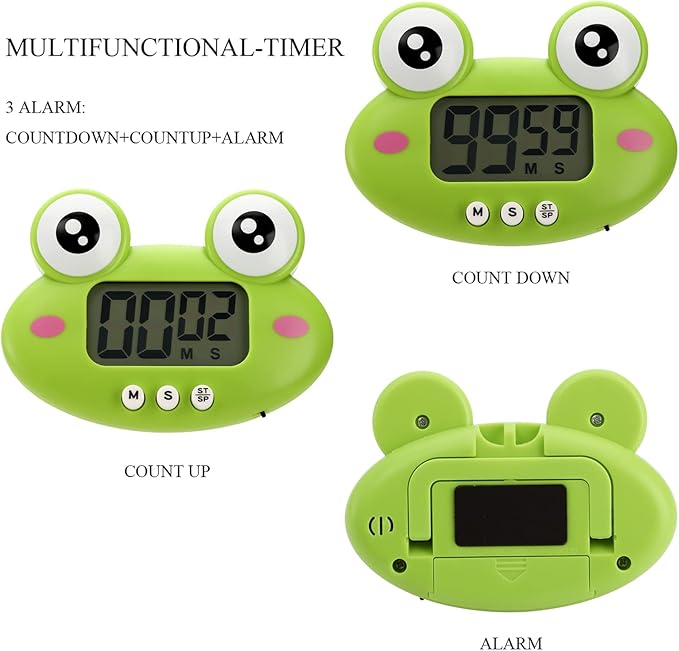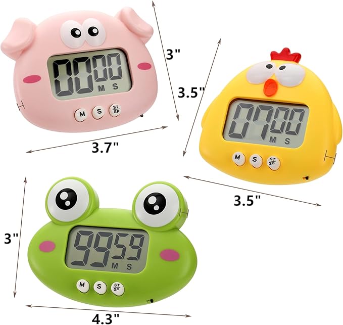 Q205 DEAYOU Paquete de 3 temporizadores digitales de cocina, (cerdito,rana y vaca). Los dígitos grandes y llamativos que se muestran en la pantalla grande LCD le permiten ver fácilmente el temporizador en cualquier rincón de la habitación. El rango de tiempo máximo de 99 minutos y 59 segundos, satisface la necesidad de aula, después de la escuela, aprendizaje, ejercicio, actividad de cocina. Gran temporizador de cuenta regresiva y cuenta regresiva para ayudarte a administrar el tiempo con precisión El paquete incluye 3 paquetes de temporizadores digitales de cocina. Cada temporizador electrónico mide aproximadamente 3.5-4.3 pulgadas de largo x 0.8 pulgadas de grosor x 3 a 3.5 pulgadas de alto. Los bonitos diseños de animales de dibujos animados y los colores vivos brillantes los hacen perfectos para llamar la atención de los niños, ayudando a tus hijos a mejorar su capacidad de gestión del tiempo desde una edad temprana Nuestros temporizadores magnéticos para aula están hechos de plástico ABS de alta gama, seguro y no tóxico, resistente y ligero, no es fácil de romper y duradero para un uso prolongado. Los botones de plástico de alta calidad también tienen un toque fuerte, muy fácil de leer y configurar. Ten en cuenta que la batería no está incluida Puedes contar para usarlo como temporizador de cocción o contar para usarlo como cronómetro. Estos pequeños temporizadores digitales son adecuados para hornear, laboratorio, fitness, belleza, niños que comen, sala de conferencias, reuniones, ejercicio, deportes, juegos, barbacoa, salas de estudio, dormitorios, aulas y mucho más Nuestro temporizador de 1 minuto cuenta con alarma fuerte, fuerte parte trasera magnética, soporte retráctil y agujero para colgar, que se puede fijar firmemente en cualquier superficie metálica, pararse en la mesa y colgar en cualquier lugar. Los tonos de llamada fuertes te impiden olvidar cosas vitales. Simplemente presiona los botones “M” y “S” al mismo tiempo para restablecer, mantén presionado el botón durante 3 segundos para acelerar. Enviamos a toda la republica pago contra entrega. Aceptamos tarjeta de crédito y debito.