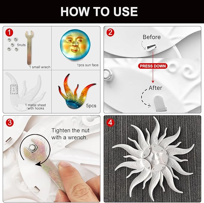 Q295 Decoración de pared de sol de metal grande – 23.6 pulgadas, decoración de pared al aire libre Diseño único: el arte de pared de metal con sol es una opción ideal para decoraciones de pared, que puede aportar una sensación de diseño y arte a tu hogar. Esculturas únicas de metal 3D para pared, hechas de materiales metálicos de alta calidad, están cuidadosamente elaboradas a mano, con exquisita mano de obra, superficies lisas y colores brillantes, añadiendo un toque de color a tu espacio. Excelente decoración: la decoración de pared solar de metal es muy adecuada para uso en interiores y exteriores, añadiendo un estilo único a tu jardín, patio, balcón, sala de estar, dormitorio, etc. También se puede utilizar como un regalo para familiares y amigos. Fácil de instalar: la decoración de pared solar de metal viene con un gancho de metal resistente, por lo que es fácil de instalar en la pared o el techo. Se puede instalar fácilmente en unos minutos de acuerdo con las instrucciones de instalación que proporcionamos. Regalo ideal: las obras de arte de metal se pueden utilizar como un regalo para aniversario, día de San Valentín, día de la madre, día del trabajo, día de Acción de Gracias, Navidad y otras festividades. Es el mejor regalo para aquellos que aman la jardinería, la decoración y la vida. Enviamos a toda la republica pago contra entrega. Aceptamos tarjeta de crédito y debito.