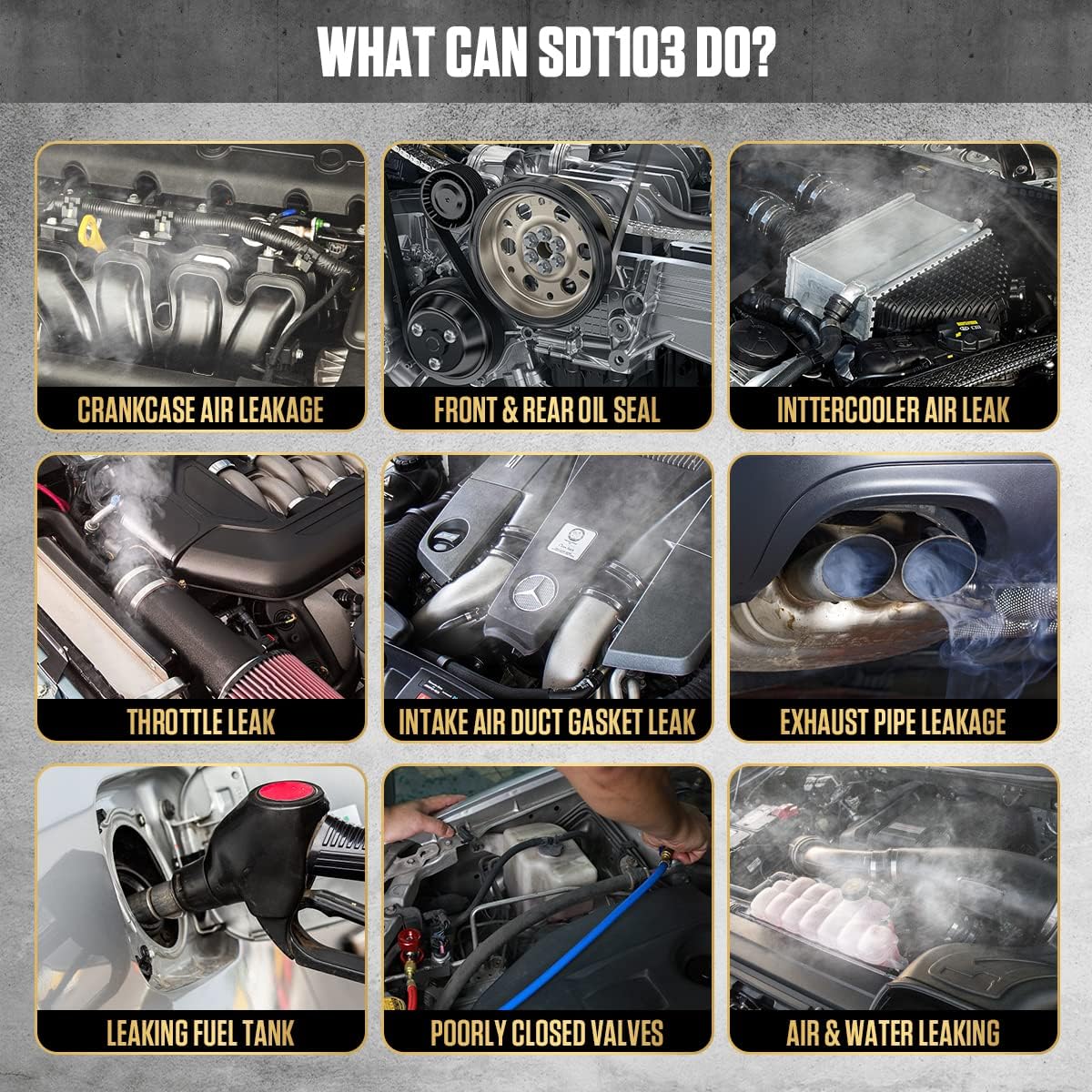 Sin bomba de aire: 1. El detector de fugas de humo AUTOOL SDT103 no viene con una bomba de aire interna, por lo que deberás conectarlo a una fuente de aire externa de taller y una fuente de alimentación de vehículo de 12 V para traer el aire del taller. 2. Gire el dial de control de flujo del detector de fugas de humo AUTOOL SDT103 en sentido antihorario para abrir el flujo de aire y, a continuación, encienda la alimentación en la parte posterior del dispositivo. Esto iniciará la máquina AUTOOL SDT103, generando humo. (Cuando agregues aceite de humo al detector de fugas de humo AUTOOL SDT103, asegúrate de no exceder los 0.7 fl oz, y utiliza aceite de bebé o aceite de parafina).