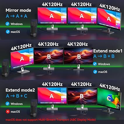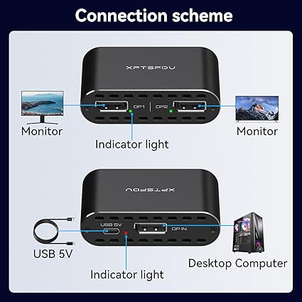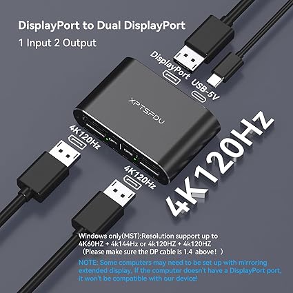 Q385.00 Divisor DisplayPort a Dual Displayport 4K120Hz DP a DP dual para monitores duales Divisor DisplayPort a DisplayPort dual: Extiende el monitor de tu computadora con este divisor DisplayPort a DisplayPort dual, refleja o extiende señales 4K DP desde una fuente a pantallas de doble puerto de pantalla y sincroniza audio y video. Nota: Mac OS no admite la expansión de dos monitores diferentes. El puerto USB C del producto debe estar conectado a una toma de corriente para la fuente de alimentación durante el uso. Si encuentras algún problema durante el uso, puedes ponerte en contacto con nosotros en cualquier momento, nuestro equipo profesional de soporte posventa te proporcionará soluciones en 24 horas Comprueba la compatibilidad: este divisor requiere que tu laptop tenga un puerto DP, o tu mini PC y tarjeta gráfica de escritorio es uno de los siguientes modelos. Mini PC: Entusiasta de NUC 12 en el tel, A-SUS ExpertCenter, D-ell OptiPlex, Minisforum Venus, Beelink SER8/SER9 SER5, H-P EliteDesk. Modelos VGA: NVI-DIA GeForce RTX/GTX, AM-D Radeon RX7000/RX6000, In-tel Arc A750/A770/A680, AAEO-N GAR-A750E. Para modelos compatibles específicos, comprueba la segunda imagen principal y la segunda imagen de la descripción del producto para confirmación 【Nota importante!!!】1. El divisor de puerto de pantalla para monitores duales requiere que su computadora sea compatible con la versión DP1.4; 2. Utilice DP1.4 o superior al cable DP estándar, y la longitud del cable DP no excede los 1.8M; 3. El sistema MacOS no es compatible con MST, es decir, no admite la expansión de dos pantallas diferentes; 4. No admite el uso de la estación de acoplamiento HDMI a DP o el cable adaptador para conectar el ordenador con el puerto de entrada DP del producto; 5. El cable DP no está incluido en el paquete. 6. Asegúrese de que la configuración de pantalla de su computadora se haya configurado en Modo extendido y que la computadora tenga un monitor externo encendido 【Resolución de hasta 4K120Hz】 Esta división de dp para monitores duales admite una resolución de hasta 4K120Hz y es retrocompatible con resoluciones como 4K60Hz y 1080p60Hz. La resolución de ultra alta definición te permite disfrutar de colores vibrantes sin precedentes y detalles finos para una experiencia de visualización inmersiva. Nota: Si desea emitir 4K120Hz, asegúrese de que su cable DP y equipo admiten 4K120Hz Modo de expansión y modo espejo: este divisor de puerto de pantalla admite tanto el modo de expansión como el modo espejo. Modo extendido: La computadora y dos monitores pueden mostrar tres imágenes diferentes (ABC); Modo espejo: Ambos monitores muestran la misma imagen (AAA/ABB). Nota: Si no puede expandir los monitores durante el uso, intente configurar la configuración de visualización del equipo en Modo expandido y asegúrese de que el equipo tiene el monitor externo encendido Ampliamente compatible: este divisor de pantalla tiene características compatibles con Windows/Vista/XP, Linux y Unix. Soporta dispositivos de entrada, como PC, laptop, que es ideal para enseñanza multimedia, sala de conferencias, oficina y juegos. No hay cable de longitud fija conectado al lado de entrada del divisor Displayport Monirtor, puedes conectar diferentes longitudes de cables DP de acuerdo a la situación real para cumplir sus necesidades de conexión diferente distancias.Nota: El cable DP se recomienda no más de 1.8M, de lo contrario puede afectar el funcionamiento normal Carcasa de aluminio: esta carcasa de divisor de pantalla a 2 pantallas está hecha de aleación de aluminio de alta calidad, que tiene buena durabilidad y estabilidad, y los disipadores de calor en ambos lados están diseñados para garantizar la disipación del calor y prolongar la vida útil del producto. Si encuentras algún problema durante el uso, puedes ponerte en contacto con nosotros en cualquier momento, nuestro equipo de soporte posventa te proporcionará soluciones Enviamos a toda la republica pago contra entrega. Aceptamos tarjeta de crédito y debito.