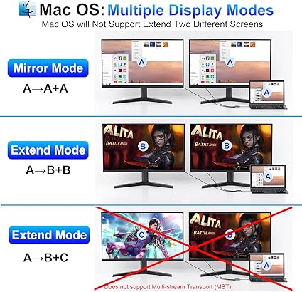Q285.00 Divisor DisplayPort para monitores duales, adaptador divisor USB C a Dual DisplayPort de 4K a 60H Adaptador divisor USB C a Dual Display: el adaptador divisor USB C a Dual DisplayPort es capaz de conectar un puerto USB C a un adaptador de monitor dual. Nota: El sistema Android solo admite el modo AAA (modo espejo); Mac OS soporta AAA y modo ABB (no admite el modo MST ABC); Windows OS admite el modo AAA, ABB, ABA y ABC Soporte de pantalla 4K dual: extiende o refleja fácilmente la pantalla de tu laptop con puertos DisplayPort de doble monitor. Cuando un solo puerto DisplayPort está funcionando, la resolución es de hasta 4K @120Hz. Cuando ambos puertos DisplayPort funcionan, la resolución máxima admitida se limita a 4K @60Hz. Este adaptador USB C a DisplayPort es retrocompatible con 4K @30Hz para resoluciones de 2K/1080P. Nota: (Importante: SOLO cuando sus dispositivos admiten resolución 4K, la salida de video será 4K, asegúrese de utilizar un cable DisplayPort 2.0 o mejor) Resolución 4K y salida de TV: el adaptador divisor de doble monitor Extended Display utiliza tecnología MST, maximizando el potencial de tu tarjeta de video existente para ofrecer una impresionante resolución Ultra HD 4K, cuatro veces más nítida que 1080p, es ideal para equipos AV modernos. Equipado con terminales adaptador de monitor dual, puede extender fácilmente la computadora portátil a dos monitores. Disfruta de videos de alta calidad en tu TV, monitor o proyector. Ya sea para presentaciones o noches de cine, sumérgete en imágenes nítidas (Nota: si no estás seguro de si la interfaz es compatible, consulta el servicio al cliente) Carga rápida USB 3.0 + PD: el adaptador de monitor dual para 2 monitores cuenta con un puerto USB 3.0, con velocidades de transferencia ultrarrápidas de hasta 5 Gbps. Compatible con memoria USB, mouse, teclados, lectores de tarjetas SD, discos duros externos, controladores de juegos y más. Además, el adaptador de monitor dual proporciona una carga de paso a través de alta velocidad de hasta 100W. Ideal para cargar la mayoría de los puertos USB C en computadoras portátiles y tabletas. Carga de alta velocidad y segura, ahorra tiempo de carga y disfruta de más diversión de juego. Compatible con múltiples dispositivos: el puerto de pantalla a USB C es un adaptador ideal para compatibilidad con todos los dispositivos Thunderbolt 3 (Mac Book Pro 2020 2019, Mac Book Air2019-2020, Dell XPS13/15, Lenovo Yoga 720/910/920/930, Microsoft Surface Book 2/Surface Go/Surface Laptop 3, Dell Lati). tude 13 7 000/ Latitude 13 E7370.Nota: Este adaptador no es bidireccional y no convierte el video en la otra dirección, las tabletas y los teléfonos solo pueden reflejar la pantalla. Amplia compatibilidad: el adaptador divisor USB C a Dual DisplayPort para laptop soporta la mayoría de portátiles USB C: MacBook Pro (2016-2023), Apple iMac/iMac Pro, Dell XPS12(9250) /Dell XPS13(9350) /Dell XPS15(9550), Dell Latitude 13 7000/Latitude 13 E7370 /Lenovo Yoga 720/Yoga 910/Yoga 920/Yoga 930/HP Spectre x2 x360/HP Probook 450 G5/6/7 HP Chromebook 14/Surface Book 2 Surface Go Surface Pro 7 Surface Pro X Surface Laptop 3 y más. (Nota: algunos modelos Sony Xperia y Sharp AQUOS pueden no ser compatibles) Enviamos a toda la republica pago contra entrega. Aceptamos tarjeta de crédito y debito.