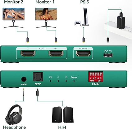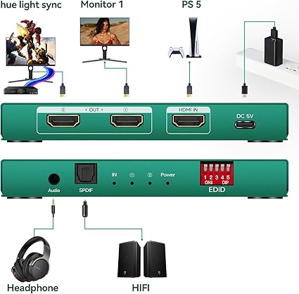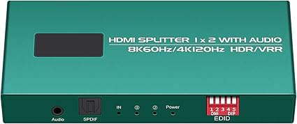 Q365.00 Divisor HDMI 1 en 2 Salida 4K 120hz Audio Extractor tono sincronización Caja Soporte EDID Gestión hdmi 2.1 divisor 1 en 2 hacia fuera 4k 120hz para la tarjeta de captura: debe enchufar la alimentación, la entrada hdmi del enchufe, luego enchufe la salida hdmi Divisor HDMI 8K 1 en 2 salidas: el divisor soporta HDCP2.3, hdcp2.2, hdcp 1.4, HDMI 2.1 4K 144HZ, 4K 120HZ, entrada 3, salida 3M como máximo hdmi 2.1 divisor 4k 120hz 1 en 2 salidas: hdmi 2 vías hdmi divisor 1 en 2 salida: se puede utilizar para la sincronización de luz de tono, cajas de sincronización de luz de tono 4k 120Hz a 1080p 120Hz, etc. Es compatible con HDCP2.3, barra de sonido, tarjeta de captura, tarjeta gráfica, 48 Gbps, HDCP 2.3, admite VRR, ALLM, derivación HDCP, EDID, duplicado/espejo/copia, downscale, HDR, Dolby Vision Atmos Divisor HDMI 1 en 2 salidas 4k 120 hz: este divisor HDMI 1 en 2 salidas 4k 120hz no está disponible para PC para extender monitores. Solo divide una señal de entrada HDMI en dos salidas HDMI mismas señales. Resolución compatible: hasta 8K @60Hz, 4K @120Hz, 4K @144Hz, 8k 60Hz, 4k 60hz【NO bidireccional】No es compatible con salida 2 en 1 Divisor HDMI 1 en 2 salidas 8k para TV dual: HDMI Duplicator 4k 120hz 1 en 2 salidas para pantallas duales; Conecte una fuente HDMI a dos pantallas HDMI; Admite divisor HDMI, escalando la fuente 4K 120Hz a TV 1080P 120Hz o escalando 4K 60Hz a 1080P 60Hz. O escala hacia abajo 8K 60 YUV422/420Hz a 44k60Hz, o 8K 60 YUV422/420Hz a 1080P 60Hz, no es compatible con 8K 60Hz RGB444/YUV444 a 4K60Hz/1080P60Hz. Para mantener una calidad estable a 4K120Hz, pide cables HDMI 2.1 juntos divisor hdmi 4k 120hz 1 en 2 salidas: hdmi 2.1 Splitter 1×2 4k 120hz soporta salida de audio SPDIF y 3.5, y se puede utilizar para extractores de audio PS5. 3.5 solo admite 2.0CH y spdif puede admitir canales 5.1 y 2.0. Solo la salida HDMI admite canales 7.1. Divisor HDMI de 8k 1 en 2 salidas 4k 120 Hz: HDMI Duplicator 1 en 2 salidas 4k 120hz soporta HDR, VRR y ATMOS 7.1, por lo que es fácil separar señales de dispositivo con interfaces HDMI estándar. Entrada para: Computadora PS3, PS4 Pro, Fire Stick, reproductor de DVD Blu ray, receptor de satélite Route Roku, Chromecast, PC, decodificadores, etc. Salida: Apple TV, HD listo, Full HD TV, monitor HD, Samsung TV, proyector, etc Enviamos a toda la republica pago contra entrega. Aceptamos tarjeta de crédito y debito.