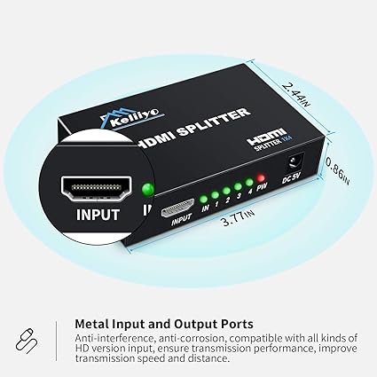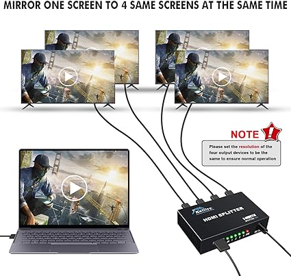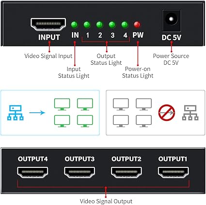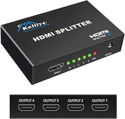 Q195.00 Divisor HDMI 1 en 4 Salidas V1.4b Alimentado Divisor de Video HDMI. Divisor HDMI 1×4: este divisor HDMI 1 entrada 4 salidas duplican 1 señal de entrada HDMI a 4 señales de salida HDMI idénticas, transmite video y audio simultáneamente sin ninguna pérdida de calidad. ✅ No hay interruptor HDMI 4 entradas 1 salida, no puede cambiar 4 fuentes de señal en una pantalla. Alta compatibilidad: el divisor HDMI de 4 vías Keliiyo soporta resoluciones Full HD 1080P y 3D, puede alcanzar hasta 4K @30Hz, color profundo 408i/576i/576p/720p/1080i/1080P, funciona perfectamente con computadora, laptop, juego de PS3, Blu-ray DVD, tableta, proyectores, televisores Full HD, etc. ✅Asegúrate de que la resolución de ambos dispositivos de salida sea la misma para garantizar un funcionamiento normal. Material y transmisión: el divisor de audio HDMI Keliiyo está hecho de material de metal resistente, puerto de entrada y salida antioxidante y anticorrosión que proporciona transmisiones de señal estables. Utiliza el cable estándar HDMI AWG26 y el adaptador de CA para conectar tus dispositivos HDMI, la distancia de transmisión puede hasta 100 pies (entrada de 40 pies y salida de 60 pies ✅ cable HDMI no incluido) Amplia aplicación: los divisores HDMI HDCP V1.4 con 4 puertos se pueden utilizar para supermercado de centros comerciales, centro de control de datos, distribución de información, HDTV, STB, DVD, fábrica de proyectores, sala de espectáculos corporativos; cine en casa, educación y entrenamiento; presentación de sala de conferencias. ✅ No se pueden extender monitores Fácil de usar: este divisor HDMI de 1 x 4 es fácil de configurar y operar. Simplemente conecta tus dispositivos HDMI y el adaptador de CA, luego puedes compartir el video y audio más lujosos con tus amigos o familiares. Enviamos a toda la republica pago contra entrega. Aceptamos tarjeta de crédito y debito.