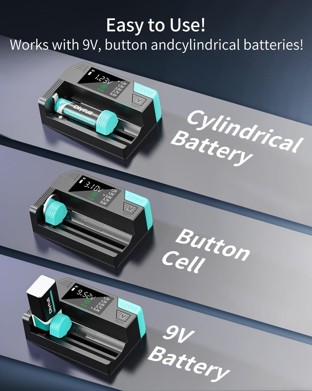 UN TOQUE FÁCIL DE USAR: Presione brevemente el botón V-SELECT para encender y recorrer los tipos de baterías. Presiona dos veces rápidamente para encender y apagar el zumbador. Pulsación larga para apagar