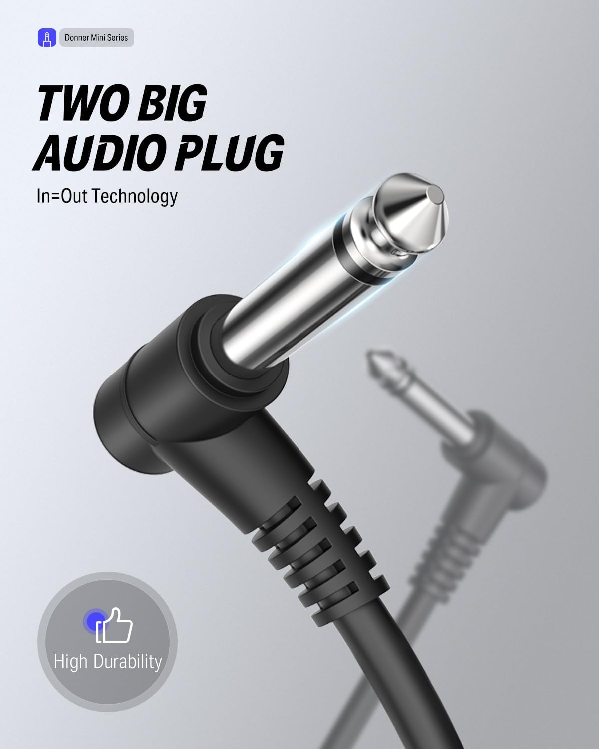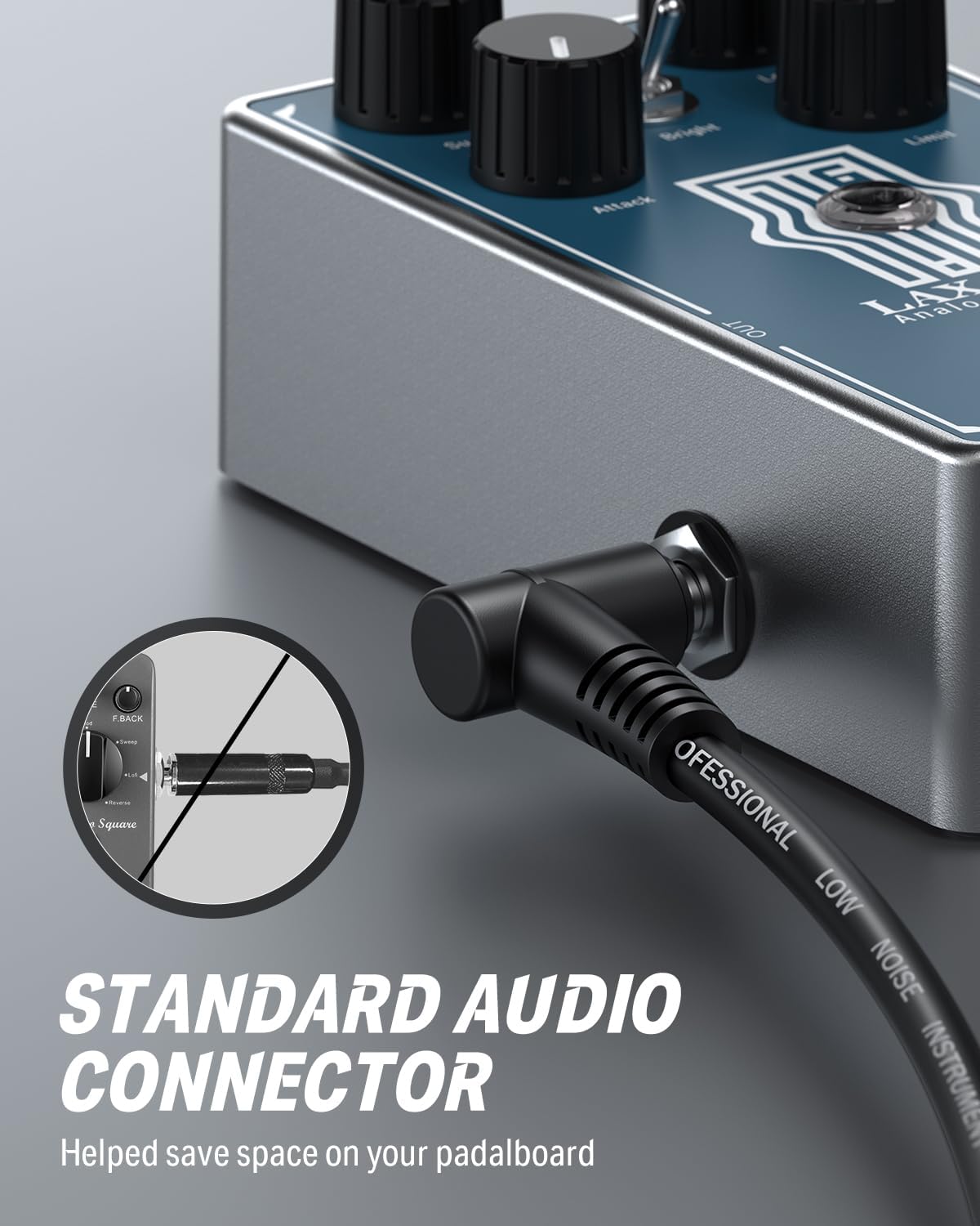 Dos conectores de audio de núcleo grande, tecnología In=Out, tapones TS moldeados de 1/4 de pulgadas son perfectos para pedaleras.