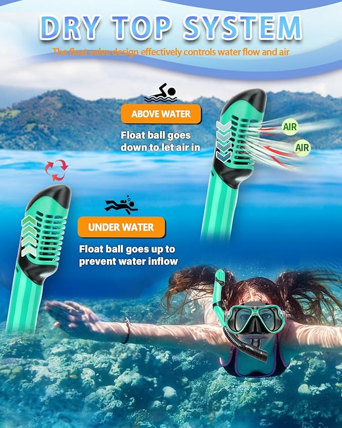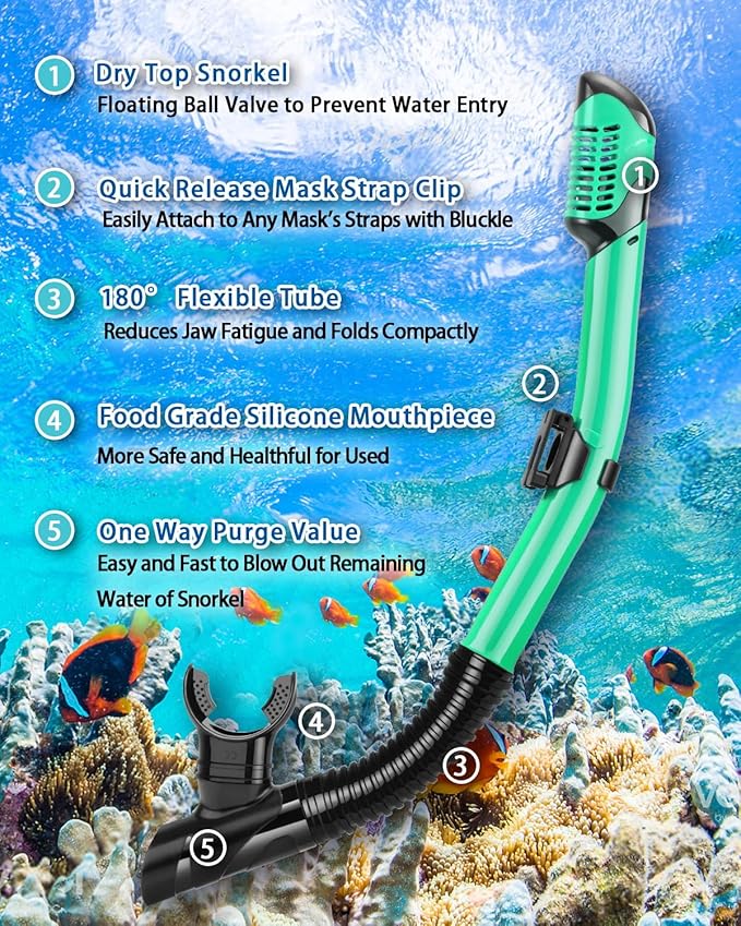 【 Snorkel superior seco para una fácil respiración】: la válvula de flotador seco evolucionada y el protector contra salpicaduras están habilitados, el snorkel superior seco está diseñado para evitar que el agua entre en el tubo de respiración incluso en aguas turbias. La válvula de purga unidireccional ayuda a limpiar rápidamente las fugas de agua en el snorkel. Puedes disfrutar de una respiración fácil y sin obstáculos mientras buceas bajo el agua.
