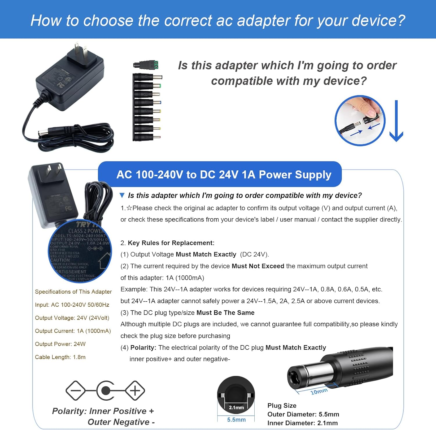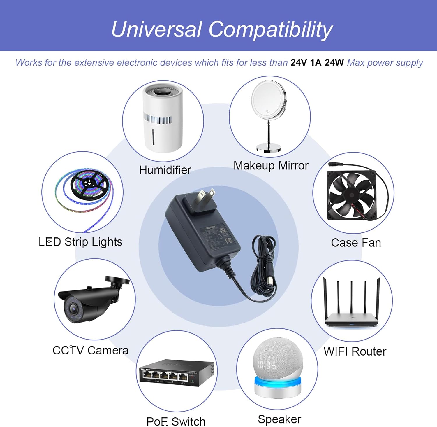 Este adaptador de corriente de 24v 1a es adecuado para dispositivos electrónicos con un voltaje de entrada de 24V y una corriente de entrada que no exceda 1A.