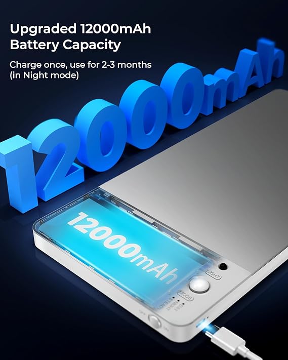 Batería de gran capacidad mejorada: esta lámpara de techo recargable mejorada está equipada con una batería de alta capacidad de 12000 mAh para un tiempo de uso prolongado. Cargado con un cable USB-C, se requiere paciencia al cargar, ya que la gran capacidad de la batería significa que tarda aproximadamente 8 horas en cargarse completamente. En modo de sensor de movimiento, puede durar aproximadamente 2 meses. En modo de encendido constante, puede funcionar continuamente hasta 12 horas (tenga en cuenta: el tiempo de uso variará dependiendo de los ajustes de brillo).
