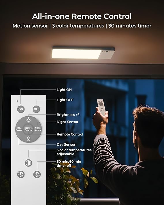 Dos modos de detección de movimiento y control remoto: en modo Día, la luz detecta movimiento todo el día (con un rango de aproximadamente 1-16 pies) y se apaga automáticamente después de 30 segundos. En el modo NOCHE, el sensor solo se activa en condiciones de poca luz. El modo STEADY permite una iluminación constante, y los modos se pueden ajustar con el control remoto.