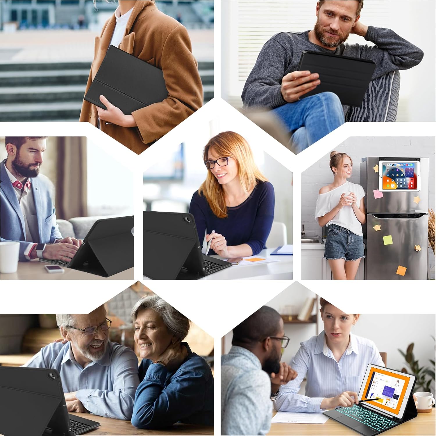 7 TECLADO DESMONTABLE BLACKLIT: Teclado y funda separados para cambiar los modos de portátil y tableta a voluntad. 7 luces de fondo de color sólido y modo de ajuste de brillo de tres niveles, el teclado está más de moda en uso, y también es conveniente usar el teclado con luz tenue. Bueno, ¿no necesitas un teclado en este momento? Simplemente retira fácilmente y se obtiene una funda de cuero ligera y totalmente protegida.